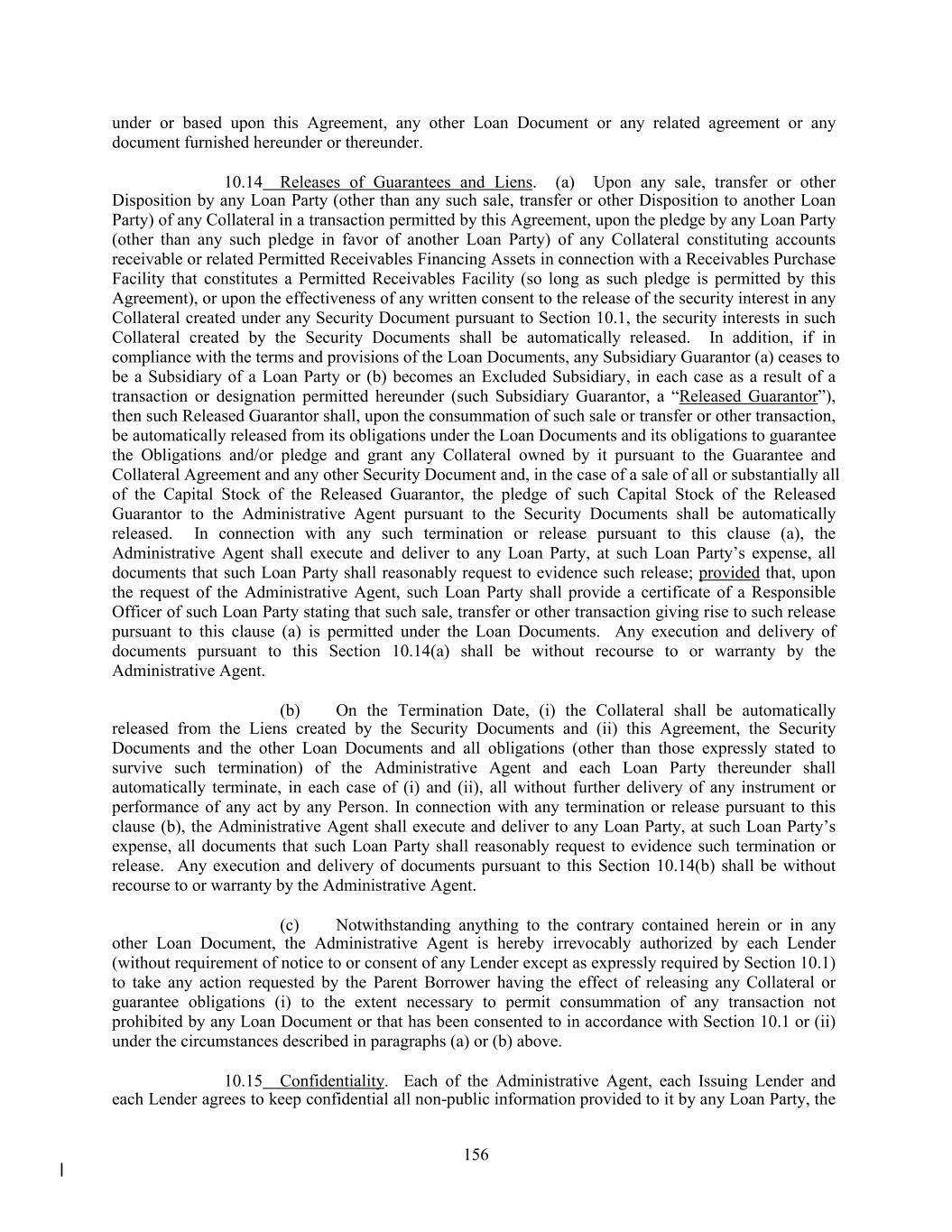 under or based upon this Agreement, any other Loan Document or any related agreement or any document furnished hereunder or thereunder. 10.14 Releases of Guarantees and Liens. (a) Upon any sale, transfer or other Disposition by any Loan Party (other than any such sale, transfer or other Disposition to another Loan Party) of any Collateral in a transaction permitted by this Agreement, upon the pledge by any Loan Party (other than any such pledge in favor of another Loan Party) of any Collateral constituting accounts receivable or related Permitted Receivables Financing Assets in connection with a Receivables Purchase Facility that constitutes a Permitted Receivables Facility (so long as such pledge is permitted by this Agreement), or upon the effectiveness of any written consent to the release of the security interest in any Collateral created under any Security Document pursuant to Section 10.1, the security interests in such Collateral created by the Security Documents shall be automatically released. In addition, if in compliance with the terms and provisions of the Loan Documents, any Subsidiary Guarantor (a) ceases to be a Subsidiary of a Loan Party or (b) becomes an Excluded Subsidiary, in each case as a result of a transaction or designation permitted hereunder (such Subsidiary Guarantor, a “Released Guarantor”), then such Released Guarantor shall, upon the consummation of such sale or transfer or other transaction, be automatically released from its obligations under the Loan Documents and its obligations to guarantee the Obligations and/or pledge and grant any Collateral owned by it pursuant to the Guarantee and Collateral Agreement and any other Security Document and, in the case of a sale of all or substantially all of the Capital Stock of the Released Guarantor, the pledge of such Capital Stock of the Released Guarantor to the Administrative Agent pursuant to the Security Documents shall be automatically released. In connection with any such termination or release pursuant to this clause (a), the Administrative Agent shall execute and deliver to any Loan Party, at such Loan Party’s expense, all documents that such Loan Party shall reasonably request to evidence such release; provided that, upon the request of the Administrative Agent, such Loan Party shall provide a certificate of a Responsible Officer of such Loan Party stating that such sale, transfer or other transaction giving rise to such release pursuant to this clause (a) is permitted under the Loan Documents. Any execution and delivery of documents pursuant to this Section 10.14(a) shall be without recourse to or warranty by the Administrative Agent. (b) On the Termination Date, (i) the Collateral shall be automatically released from the Liens created by the Security Documents and (ii) this Agreement, the Security Documents and the other Loan Documents and all obligations (other than those expressly stated to survive such termination) of the Administrative Agent and each Loan Party thereunder shall automatically terminate, in each case of (i) and (ii), all without further delivery of any instrument or performance of any act by any Person. In connection with any termination or release pursuant to this clause (b), the Administrative Agent shall execute and deliver to any Loan Party, at such Loan Party’s expense, all documents that such Loan Party shall reasonably request to evidence such termination or release. Any execution and delivery of documents pursuant to this Section 10.14(b) shall be without recourse to or warranty by the Administrative Agent. (c) Notwithstanding anything to the contrary contained herein or in any other Loan Document, the Administrative Agent is hereby irrevocably authorized by each Lender (without requirement of notice to or consent of any Lender except as expressly required by Section 10.1) to take any action requested by the Parent Borrower having the effect of releasing any Collateral or guarantee obligations (i) to the extent necessary to permit consummation of any transaction not prohibited by any Loan Document or that has been consented to in accordance with Section 10.1 or (ii) under the circumstances described in paragraphs (a) or (b) above. 10.15 Confidentiality. Each of the Administrative Agent, each Issuing Lender and each Lender agrees to keep confidential all non-public information provided to it by any Loan Party, the 156