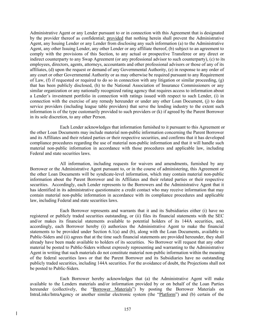Administrative Agent or any Lender pursuant to or in connection with this Agreement that is designated by the provider thereof as confidential; provided that nothing herein shall prevent the Administrative Agent, any Issuing Lender or any Lender from disclosing any such information (a) to the Administrative Agent, any other Issuing Lender, any other Lender or any affiliate thereof, (b) subject to an agreement to comply with the provisions of this Section, to any actual or prospective Transferee or any direct or indirect counterparty to any Swap Agreement (or any professional advisor to such counterparty), (c) to its employees, directors, agents, attorneys, accountants and other professional advisors or those of any of its affiliates, (d) upon the request or demand of any Governmental Authority, (e) in response to any order of any court or other Governmental Authority or as may otherwise be required pursuant to any Requirement of Law, (f) if requested or required to do so in connection with any litigation or similar proceeding, (g) that has been publicly disclosed, (h) to the National Association of Insurance Commissioners or any similar organization or any nationally recognized rating agency that requires access to information about a Lender’s investment portfolio in connection with ratings issued with respect to such Lender, (i) in connection with the exercise of any remedy hereunder or under any other Loan Document, (j) to data service providers (including league table providers) that serve the lending industry to the extent such information is of the type customarily provided to such providers or (k) if agreed by the Parent Borrower in its sole discretion, to any other Person. Each Lender acknowledges that information furnished to it pursuant to this Agreement or the other Loan Documents may include material non-public information concerning the Parent Borrower and its Affiliates and their related parties or their respective securities, and confirms that it has developed compliance procedures regarding the use of material non-public information and that it will handle such material non-public information in accordance with those procedures and applicable law, including Federal and state securities laws. All information, including requests for waivers and amendments, furnished by any Borrower or the Administrative Agent pursuant to, or in the course of administering, this Agreement or the other Loan Documents will be syndicate-level information, which may contain material non-public information about the Parent Borrower and its Affiliates and their related parties or their respective securities. Accordingly, each Lender represents to the Borrowers and the Administrative Agent that it has identified in its administrative questionnaire a credit contact who may receive information that may contain material non-public information in accordance with its compliance procedures and applicable law, including Federal and state securities laws. Each Borrower represents and warrants that it and its Subsidiaries either (i) have no registered or publicly traded securities outstanding, or (ii) files its financial statements with the SEC and/or makes its financial statements available to potential holders of its 144A securities, and, accordingly, each Borrower hereby (i) authorizes the Administrative Agent to make the financial statements to be provided under Section 6.1(a) and (b), along with the Loan Documents, available to Public-Siders and (ii) agrees that at the time such financial statements are provided hereunder, they shall already have been made available to holders of its securities. No Borrower will request that any other material be posted to Public-Siders without expressly representing and warranting to the Administrative Agent in writing that such materials do not constitute material non-public information within the meaning of the federal securities laws or that the Parent Borrower and its Subsidiaries have no outstanding publicly traded securities, including 144A securities. For the avoidance of doubt, the Projections shall not be posted to Public-Siders. Each Borrower hereby acknowledges that (a) the Administrative Agent will make available to the Lenders materials and/or information provided by or on behalf of the Loan Parties hereunder (collectively, the “Borrower Materials”) by posting the Borrower Materials on IntraLinks/IntraAgency or another similar electronic system (the “Platform”) and (b) certain of the 157