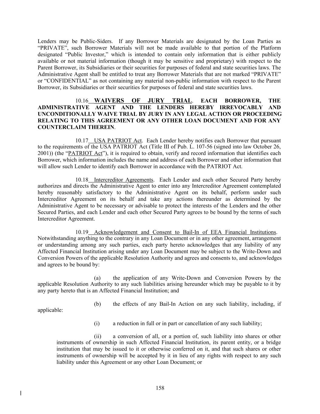 Lenders may be Public-Siders. If any Borrower Materials are designated by the Loan Parties as “PRIVATE”, such Borrower Materials will not be made available to that portion of the Platform designated “Public Investor,” which is intended to contain only information that is either publicly available or not material information (though it may be sensitive and proprietary) with respect to the Parent Borrower, its Subsidiaries or their securities for purposes of federal and state securities laws. The Administrative Agent shall be entitled to treat any Borrower Materials that are not marked “PRIVATE” or “CONFIDENTIAL” as not containing any material non-public information with respect to the Parent Borrower, its Subsidiaries or their securities for purposes of federal and state securities laws. 10.16 WAIVERS OF JURY TRIAL. EACH BORROWER, THE ADMINISTRATIVE AGENT AND THE LENDERS HEREBY IRREVOCABLY AND UNCONDITIONALLY WAIVE TRIAL BY JURY IN ANY LEGAL ACTION OR PROCEEDING RELATING TO THIS AGREEMENT OR ANY OTHER LOAN DOCUMENT AND FOR ANY COUNTERCLAIM THEREIN. 10.17 USA PATRIOT Act. Each Lender hereby notifies each Borrower that pursuant to the requirements of the USA PATRIOT Act (Title III of Pub. L. 107-56 (signed into law October 26, 2001)) (the “PATRIOT Act”), it is required to obtain, verify and record information that identifies each Borrower, which information includes the name and address of each Borrower and other information that will allow such Lender to identify each Borrower in accordance with the PATRIOT Act. 10.18 Intercreditor Agreements. Each Lender and each other Secured Party hereby authorizes and directs the Administrative Agent to enter into any Intercreditor Agreement contemplated hereby reasonably satisfactory to the Administrative Agent on its behalf, perform under such Intercreditor Agreement on its behalf and take any actions thereunder as determined by the Administrative Agent to be necessary or advisable to protect the interests of the Lenders and the other Secured Parties, and each Lender and each other Secured Party agrees to be bound by the terms of such Intercreditor Agreement. 10.19 Acknowledgement and Consent to Bail-In of EEA Financial Institutions. Notwithstanding anything to the contrary in any Loan Document or in any other agreement, arrangement or understanding among any such parties, each party hereto acknowledges that any liability of any Affected Financial Institution arising under any Loan Document may be subject to the Write-Down and Conversion Powers of the applicable Resolution Authority and agrees and consents to, and acknowledges and agrees to be bound by: (a) the application of any Write-Down and Conversion Powers by the applicable Resolution Authority to any such liabilities arising hereunder which may be payable to it by any party hereto that is an Affected Financial Institution; and (b) the effects of any Bail-In Action on any such liability, including, if applicable: (i) a reduction in full or in part or cancellation of any such liability; (ii) a conversion of all, or a portion of, such liability into shares or other instruments of ownership in such Affected Financial Institution, its parent entity, or a bridge institution that may be issued to it or otherwise conferred on it, and that such shares or other instruments of ownership will be accepted by it in lieu of any rights with respect to any such liability under this Agreement or any other Loan Document; or 158