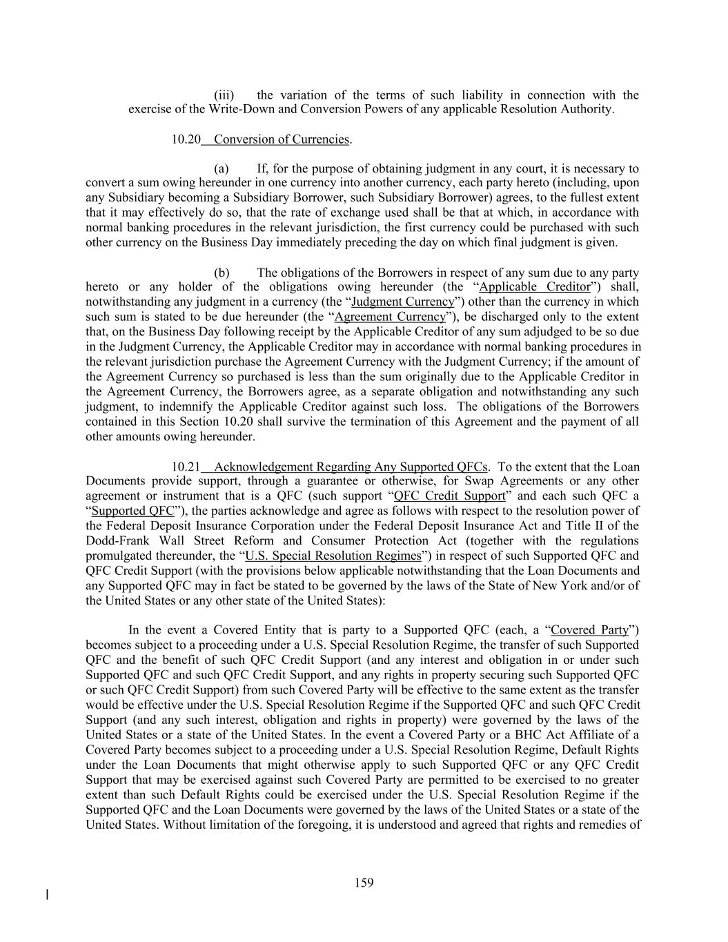 (iii) the variation of the terms of such liability in connection with the exercise of the Write-Down and Conversion Powers of any applicable Resolution Authority. 10.20 Conversion of Currencies. (a) If, for the purpose of obtaining judgment in any court, it is necessary to convert a sum owing hereunder in one currency into another currency, each party hereto (including, upon any Subsidiary becoming a Subsidiary Borrower, such Subsidiary Borrower) agrees, to the fullest extent that it may effectively do so, that the rate of exchange used shall be that at which, in accordance with normal banking procedures in the relevant jurisdiction, the first currency could be purchased with such other currency on the Business Day immediately preceding the day on which final judgment is given. (b) The obligations of the Borrowers in respect of any sum due to any party hereto or any holder of the obligations owing hereunder (the “Applicable Creditor”) shall, notwithstanding any judgment in a currency (the “Judgment Currency”) other than the currency in which such sum is stated to be due hereunder (the “Agreement Currency”), be discharged only to the extent that, on the Business Day following receipt by the Applicable Creditor of any sum adjudged to be so due in the Judgment Currency, the Applicable Creditor may in accordance with normal banking procedures in the relevant jurisdiction purchase the Agreement Currency with the Judgment Currency; if the amount of the Agreement Currency so purchased is less than the sum originally due to the Applicable Creditor in the Agreement Currency, the Borrowers agree, as a separate obligation and notwithstanding any such judgment, to indemnify the Applicable Creditor against such loss. The obligations of the Borrowers contained in this Section 10.20 shall survive the termination of this Agreement and the payment of all other amounts owing hereunder. 10.21 Acknowledgement Regarding Any Supported QFCs. To the extent that the Loan Documents provide support, through a guarantee or otherwise, for Swap Agreements or any other agreement or instrument that is a QFC (such support “QFC Credit Support” and each such QFC a “Supported QFC”), the parties acknowledge and agree as follows with respect to the resolution power of the Federal Deposit Insurance Corporation under the Federal Deposit Insurance Act and Title II of the Dodd-Frank Wall Street Reform and Consumer Protection Act (together with the regulations promulgated thereunder, the “U.S. Special Resolution Regimes”) in respect of such Supported QFC and QFC Credit Support (with the provisions below applicable notwithstanding that the Loan Documents and any Supported QFC may in fact be stated to be governed by the laws of the State of New York and/or of the United States or any other state of the United States): In the event a Covered Entity that is party to a Supported QFC (each, a “Covered Party”) becomes subject to a proceeding under a U.S. Special Resolution Regime, the transfer of such Supported QFC and the benefit of such QFC Credit Support (and any interest and obligation in or under such Supported QFC and such QFC Credit Support, and any rights in property securing such Supported QFC or such QFC Credit Support) from such Covered Party will be effective to the same extent as the transfer would be effective under the U.S. Special Resolution Regime if the Supported QFC and such QFC Credit Support (and any such interest, obligation and rights in property) were governed by the laws of the United States or a state of the United States. In the event a Covered Party or a BHC Act Affiliate of a Covered Party becomes subject to a proceeding under a U.S. Special Resolution Regime, Default Rights under the Loan Documents that might otherwise apply to such Supported QFC or any QFC Credit Support that may be exercised against such Covered Party are permitted to be exercised to no greater extent than such Default Rights could be exercised under the U.S. Special Resolution Regime if the Supported QFC and the Loan Documents were governed by the laws of the United States or a state of the United States. Without limitation of the foregoing, it is understood and agreed that rights and remedies of 159