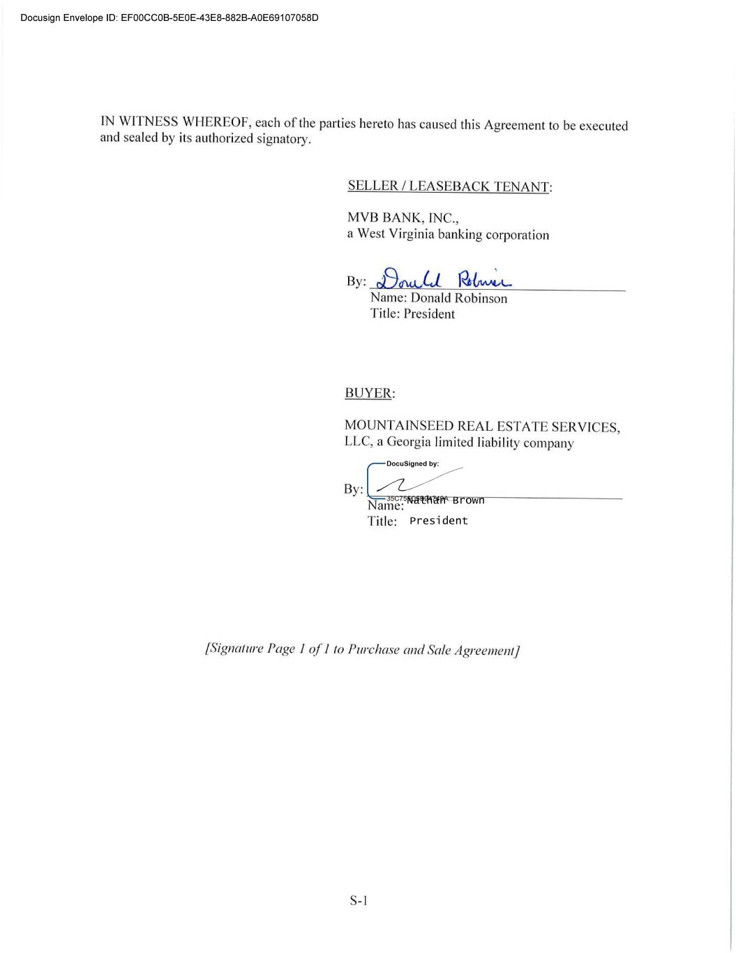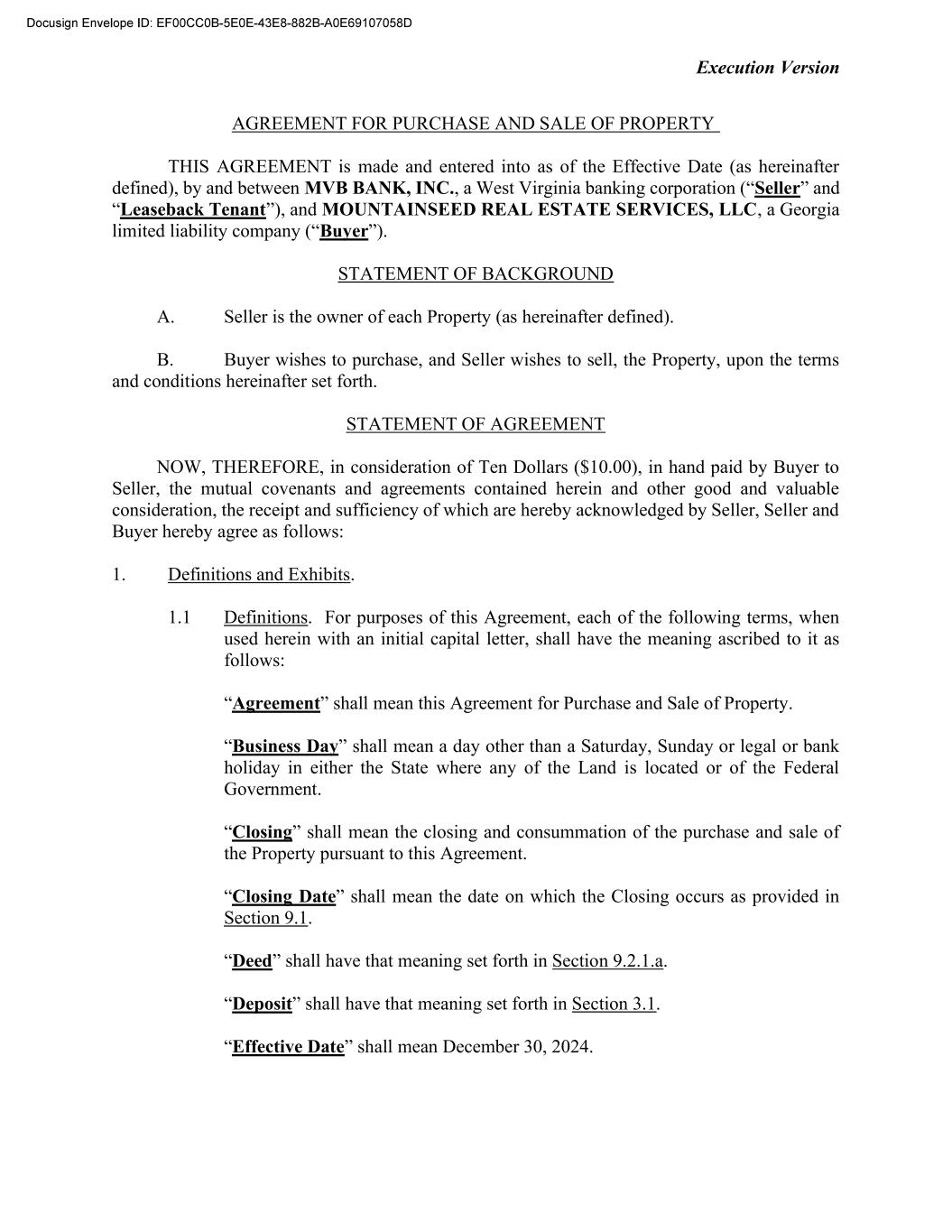 Execution Version AGREEMENT FOR PURCHASE AND SALE OF PROPERTY THIS AGREEMENT is made and entered into as of the Effective Date (as hereinafter defined), by and between MVB BANK, INC., a West Virginia banking corporation (“Seller” and “Leaseback Tenant”), and MOUNTAINSEED REAL ESTATE SERVICES, LLC, a Georgia limited liability company (“Buyer”). STATEMENT OF BACKGROUND A. Seller is the owner of each Property (as hereinafter defined). B. Buyer wishes to purchase, and Seller wishes to sell, the Property, upon the terms and conditions hereinafter set forth. STATEMENT OF AGREEMENT NOW, THEREFORE, in consideration of Ten Dollars ($10.00), in hand paid by Buyer to Seller, the mutual covenants and agreements contained herein and other good and valuable consideration, the receipt and sufficiency of which are hereby acknowledged by Seller, Seller and Buyer hereby agree as follows: 1. Definitions and Exhibits. 1.1 Definitions. For purposes of this Agreement, each of the following terms, when used herein with an initial capital letter, shall have the meaning ascribed to it as follows: “Agreement” shall mean this Agreement for Purchase and Sale of Property. “Business Day” shall mean a day other than a Saturday, Sunday or legal or bank holiday in either the State where any of the Land is located or of the Federal Government. “Closing” shall mean the closing and consummation of the purchase and sale of the Property pursuant to this Agreement. “Closing Date” shall mean the date on which the Closing occurs as provided in Section 9.1. “Deed” shall have that meaning set forth in Section 9.2.1.a. “Deposit” shall have that meaning set forth in Section 3.1. “Effective Date” shall mean December 30, 2024.