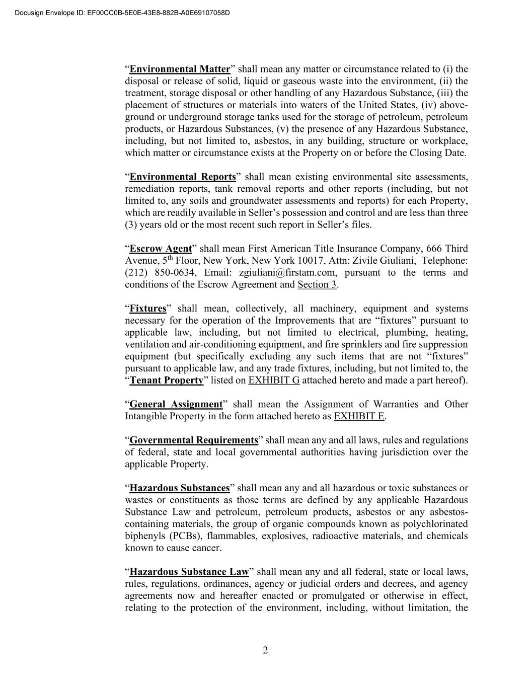 2 “Environmental Matter” shall mean any matter or circumstance related to (i) the disposal or release of solid, liquid or gaseous waste into the environment, (ii) the treatment, storage disposal or other handling of any Hazardous Substance, (iii) the placement of structures or materials into waters of the United States, (iv) above- ground or underground storage tanks used for the storage of petroleum, petroleum products, or Hazardous Substances, (v) the presence of any Hazardous Substance, including, but not limited to, asbestos, in any building, structure or workplace, which matter or circumstance exists at the Property on or before the Closing Date. “Environmental Reports” shall mean existing environmental site assessments, remediation reports, tank removal reports and other reports (including, but not limited to, any soils and groundwater assessments and reports) for each Property, which are readily available in Seller’s possession and control and are less than three (3) years old or the most recent such report in Seller’s files. “Escrow Agent” shall mean First American Title Insurance Company, 666 Third Avenue, 5th Floor, New York, New York 10017, Attn: Zivile Giuliani, Telephone: (212) 850-0634, Email: zgiuliani@firstam.com, pursuant to the terms and conditions of the Escrow Agreement and Section 3. “Fixtures” shall mean, collectively, all machinery, equipment and systems necessary for the operation of the Improvements that are “fixtures” pursuant to applicable law, including, but not limited to electrical, plumbing, heating, ventilation and air-conditioning equipment, and fire sprinklers and fire suppression equipment (but specifically excluding any such items that are not “fixtures” pursuant to applicable law, and any trade fixtures, including, but not limited to, the “Tenant Property” listed on EXHIBIT G attached hereto and made a part hereof). “General Assignment” shall mean the Assignment of Warranties and Other Intangible Property in the form attached hereto as EXHIBIT E. “Governmental Requirements” shall mean any and all laws, rules and regulations of federal, state and local governmental authorities having jurisdiction over the applicable Property. “Hazardous Substances” shall mean any and all hazardous or toxic substances or wastes or constituents as those terms are defined by any applicable Hazardous Substance Law and petroleum, petroleum products, asbestos or any asbestos- containing materials, the group of organic compounds known as polychlorinated biphenyls (PCBs), flammables, explosives, radioactive materials, and chemicals known to cause cancer. “Hazardous Substance Law” shall mean any and all federal, state or local laws, rules, regulations, ordinances, agency or judicial orders and decrees, and agency agreements now and hereafter enacted or promulgated or otherwise in effect, relating to the protection of the environment, including, without limitation, the