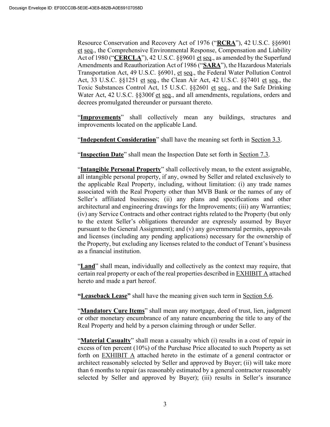 3 Resource Conservation and Recovery Act of 1976 (“RCRA”), 42 U.S.C. §§6901 et seq., the Comprehensive Environmental Response, Compensation and Liability Act of 1980 (“CERCLA”), 42 U.S.C. §§9601 et seq., as amended by the Superfund Amendments and Reauthorization Act of 1986 (“SARA”), the Hazardous Materials Transportation Act, 49 U.S.C. §6901, et seq., the Federal Water Pollution Control Act, 33 U.S.C. §§1251 et seq., the Clean Air Act, 42 U.S.C. §§7401 et seq., the Toxic Substances Control Act, 15 U.S.C. §§2601 et seq., and the Safe Drinking Water Act, 42 U.S.C. §§300f et seq., and all amendments, regulations, orders and decrees promulgated thereunder or pursuant thereto. “Improvements” shall collectively mean any buildings, structures and improvements located on the applicable Land. “Independent Consideration” shall have the meaning set forth in Section 3.3. “Inspection Date” shall mean the Inspection Date set forth in Section 7.3. “Intangible Personal Property” shall collectively mean, to the extent assignable, all intangible personal property, if any, owned by Seller and related exclusively to the applicable Real Property, including, without limitation: (i) any trade names associated with the Real Property other than MVB Bank or the names of any of Seller’s affiliated businesses; (ii) any plans and specifications and other architectural and engineering drawings for the Improvements; (iii) any Warranties; (iv) any Service Contracts and other contract rights related to the Property (but only to the extent Seller’s obligations thereunder are expressly assumed by Buyer pursuant to the General Assignment); and (v) any governmental permits, approvals and licenses (including any pending applications) necessary for the ownership of the Property, but excluding any licenses related to the conduct of Tenant’s business as a financial institution. “Land” shall mean, individually and collectively as the context may require, that certain real property or each of the real properties described in EXHIBIT A attached hereto and made a part hereof. “Leaseback Lease” shall have the meaning given such term in Section 5.6. “Mandatory Cure Items” shall mean any mortgage, deed of trust, lien, judgment or other monetary encumbrance of any nature encumbering the title to any of the Real Property and held by a person claiming through or under Seller. “Material Casualty” shall mean a casualty which (i) results in a cost of repair in excess of ten percent (10%) of the Purchase Price allocated to such Property as set forth on EXHIBIT A attached hereto in the estimate of a general contractor or architect reasonably selected by Seller and approved by Buyer; (ii) will take more than 6 months to repair (as reasonably estimated by a general contractor reasonably selected by Seller and approved by Buyer); (iii) results in Seller’s insurance