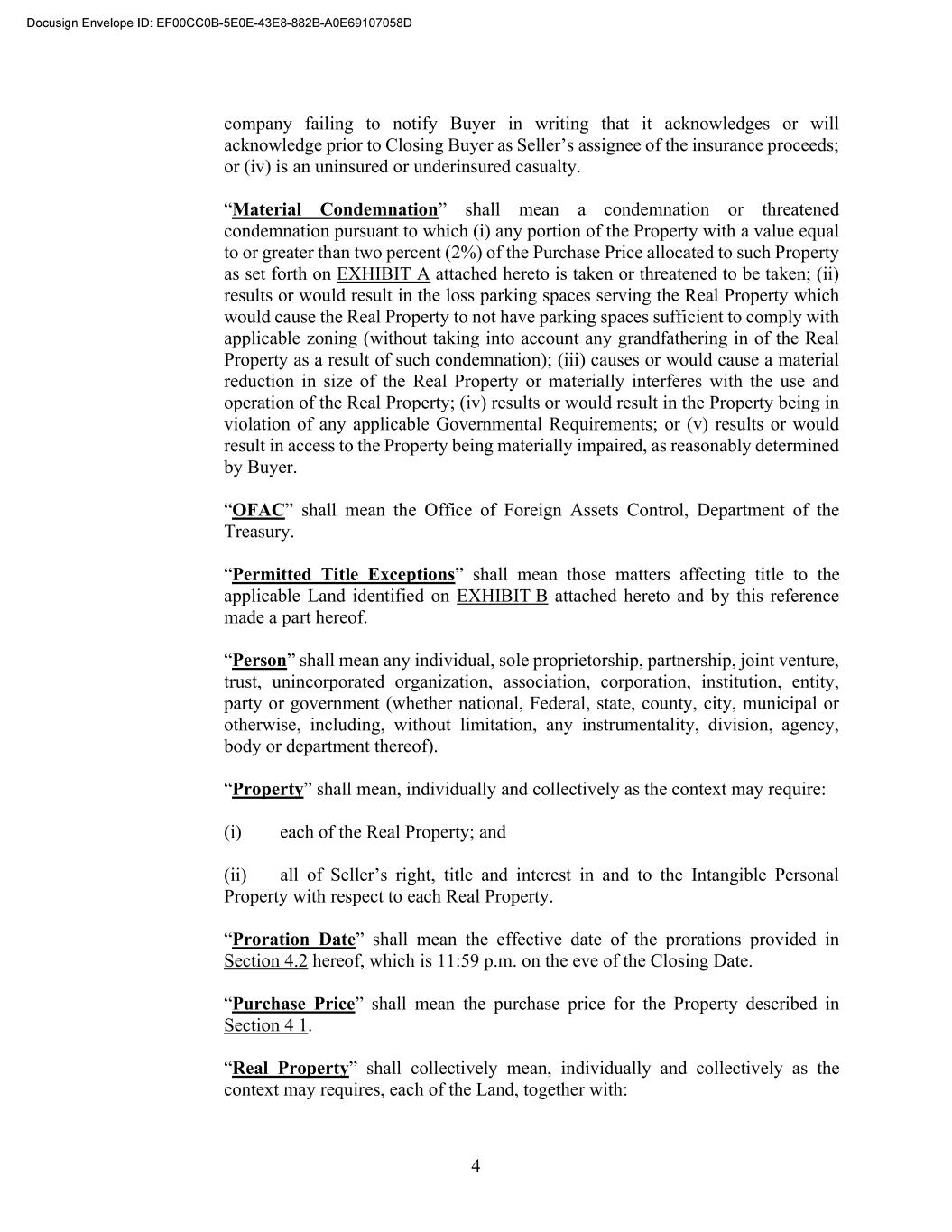 4 company failing to notify Buyer in writing that it acknowledges or will acknowledge prior to Closing Buyer as Seller’s assignee of the insurance proceeds; or (iv) is an uninsured or underinsured casualty. “Material Condemnation” shall mean a condemnation or threatened condemnation pursuant to which (i) any portion of the Property with a value equal to or greater than two percent (2%) of the Purchase Price allocated to such Property as set forth on EXHIBIT A attached hereto is taken or threatened to be taken; (ii) results or would result in the loss parking spaces serving the Real Property which would cause the Real Property to not have parking spaces sufficient to comply with applicable zoning (without taking into account any grandfathering in of the Real Property as a result of such condemnation); (iii) causes or would cause a material reduction in size of the Real Property or materially interferes with the use and operation of the Real Property; (iv) results or would result in the Property being in violation of any applicable Governmental Requirements; or (v) results or would result in access to the Property being materially impaired, as reasonably determined by Buyer. “OFAC” shall mean the Office of Foreign Assets Control, Department of the Treasury. “Permitted Title Exceptions” shall mean those matters affecting title to the applicable Land identified on EXHIBIT B attached hereto and by this reference made a part hereof. “Person” shall mean any individual, sole proprietorship, partnership, joint venture, trust, unincorporated organization, association, corporation, institution, entity, party or government (whether national, Federal, state, county, city, municipal or otherwise, including, without limitation, any instrumentality, division, agency, body or department thereof). “Property” shall mean, individually and collectively as the context may require: (i) each of the Real Property; and (ii) all of Seller’s right, title and interest in and to the Intangible Personal Property with respect to each Real Property. “Proration Date” shall mean the effective date of the prorations provided in Section 4.2 hereof, which is 11:59 p.m. on the eve of the Closing Date. “Purchase Price” shall mean the purchase price for the Property described in Section 4 1. “Real Property” shall collectively mean, individually and collectively as the context may requires, each of the Land, together with: