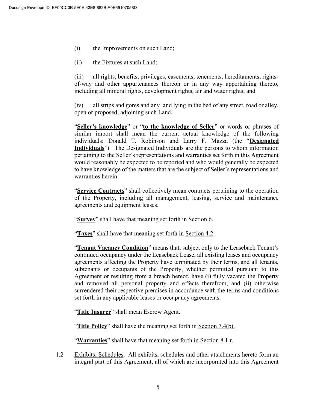 5 (i) the Improvements on such Land; (ii) the Fixtures at such Land; (iii) all rights, benefits, privileges, easements, tenements, hereditaments, rights- of-way and other appurtenances thereon or in any way appertaining thereto, including all mineral rights, development rights, air and water rights; and (iv) all strips and gores and any land lying in the bed of any street, road or alley, open or proposed, adjoining such Land. “Seller’s knowledge” or “to the knowledge of Seller” or words or phrases of similar import shall mean the current actual knowledge of the following individuals: Donald T. Robinson and Larry F. Mazza (the “Designated Individuals”). The Designated Individuals are the persons to whom information pertaining to the Seller’s representations and warranties set forth in this Agreement would reasonably be expected to be reported and who would generally be expected to have knowledge of the matters that are the subject of Seller’s representations and warranties herein. “Service Contracts” shall collectively mean contracts pertaining to the operation of the Property, including all management, leasing, service and maintenance agreements and equipment leases. “Survey” shall have that meaning set forth in Section 6. “Taxes” shall have that meaning set forth in Section 4.2. “Tenant Vacancy Condition” means that, subject only to the Leaseback Tenant’s continued occupancy under the Leaseback Lease, all existing leases and occupancy agreements affecting the Property have terminated by their terms, and all tenants, subtenants or occupants of the Property, whether permitted pursuant to this Agreement or resulting from a breach hereof, have (i) fully vacated the Property and removed all personal property and effects therefrom, and (ii) otherwise surrendered their respective premises in accordance with the terms and conditions set forth in any applicable leases or occupancy agreements. “Title Insurer” shall mean Escrow Agent. “Title Policy” shall have the meaning set forth in Section 7.4(b). “Warranties” shall have that meaning set forth in Section 8.1.r. 1.2 Exhibits; Schedules. All exhibits, schedules and other attachments hereto form an integral part of this Agreement, all of which are incorporated into this Agreement