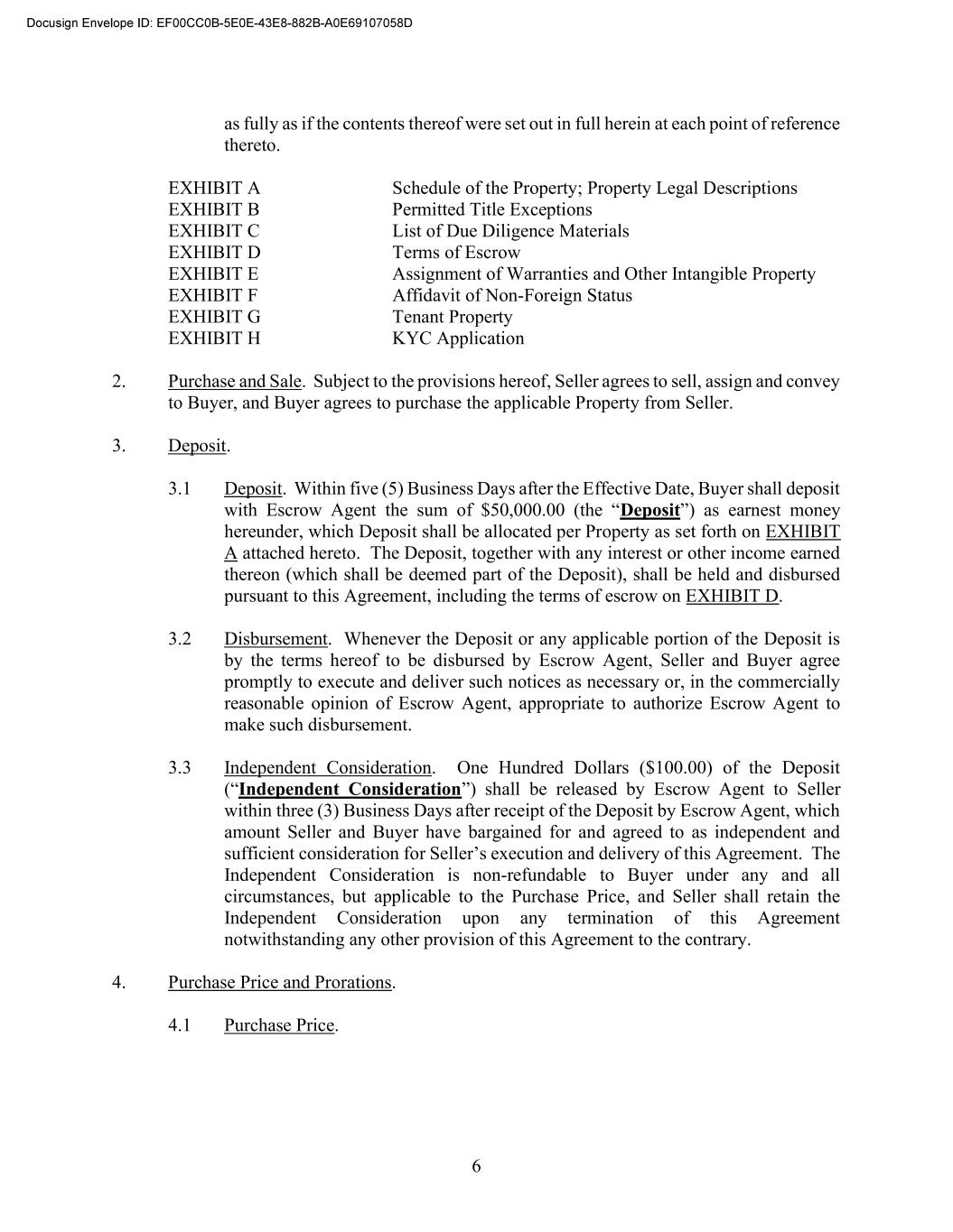 6 as fully as if the contents thereof were set out in full herein at each point of reference thereto. EXHIBIT A Schedule of the Property; Property Legal Descriptions EXHIBIT B Permitted Title Exceptions EXHIBIT C List of Due Diligence Materials EXHIBIT D Terms of Escrow EXHIBIT E Assignment of Warranties and Other Intangible Property EXHIBIT F Affidavit of Non-Foreign Status EXHIBIT G Tenant Property EXHIBIT H KYC Application 2. Purchase and Sale. Subject to the provisions hereof, Seller agrees to sell, assign and convey to Buyer, and Buyer agrees to purchase the applicable Property from Seller. 3. Deposit. 3.1 Deposit. Within five (5) Business Days after the Effective Date, Buyer shall deposit with Escrow Agent the sum of $50,000.00 (the “Deposit”) as earnest money hereunder, which Deposit shall be allocated per Property as set forth on EXHIBIT A attached hereto. The Deposit, together with any interest or other income earned thereon (which shall be deemed part of the Deposit), shall be held and disbursed pursuant to this Agreement, including the terms of escrow on EXHIBIT D. 3.2 Disbursement. Whenever the Deposit or any applicable portion of the Deposit is by the terms hereof to be disbursed by Escrow Agent, Seller and Buyer agree promptly to execute and deliver such notices as necessary or, in the commercially reasonable opinion of Escrow Agent, appropriate to authorize Escrow Agent to make such disbursement. 3.3 Independent Consideration. One Hundred Dollars ($100.00) of the Deposit (“Independent Consideration”) shall be released by Escrow Agent to Seller within three (3) Business Days after receipt of the Deposit by Escrow Agent, which amount Seller and Buyer have bargained for and agreed to as independent and sufficient consideration for Seller’s execution and delivery of this Agreement. The Independent Consideration is non-refundable to Buyer under any and all circumstances, but applicable to the Purchase Price, and Seller shall retain the Independent Consideration upon any termination of this Agreement notwithstanding any other provision of this Agreement to the contrary. 4. Purchase Price and Prorations. 4.1 Purchase Price.