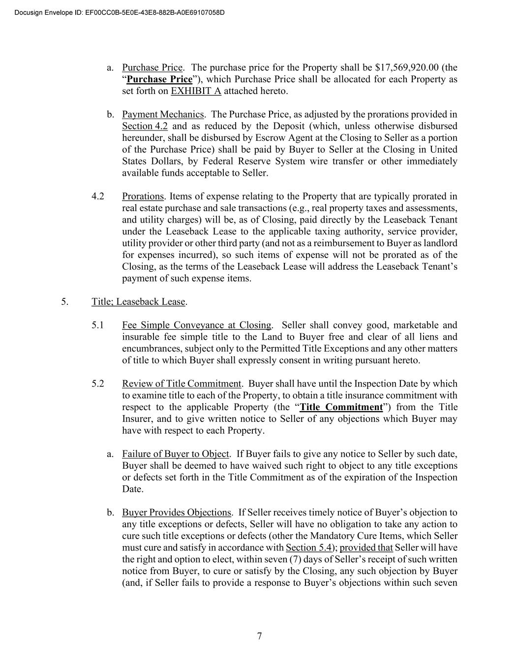 7 a. Purchase Price. The purchase price for the Property shall be $17,569,920.00 (the “Purchase Price”), which Purchase Price shall be allocated for each Property as set forth on EXHIBIT A attached hereto. b. Payment Mechanics. The Purchase Price, as adjusted by the prorations provided in Section 4.2 and as reduced by the Deposit (which, unless otherwise disbursed hereunder, shall be disbursed by Escrow Agent at the Closing to Seller as a portion of the Purchase Price) shall be paid by Buyer to Seller at the Closing in United States Dollars, by Federal Reserve System wire transfer or other immediately available funds acceptable to Seller. 4.2 Prorations. Items of expense relating to the Property that are typically prorated in real estate purchase and sale transactions (e.g., real property taxes and assessments, and utility charges) will be, as of Closing, paid directly by the Leaseback Tenant under the Leaseback Lease to the applicable taxing authority, service provider, utility provider or other third party (and not as a reimbursement to Buyer as landlord for expenses incurred), so such items of expense will not be prorated as of the Closing, as the terms of the Leaseback Lease will address the Leaseback Tenant’s payment of such expense items. 5. Title; Leaseback Lease. 5.1 Fee Simple Conveyance at Closing. Seller shall convey good, marketable and insurable fee simple title to the Land to Buyer free and clear of all liens and encumbrances, subject only to the Permitted Title Exceptions and any other matters of title to which Buyer shall expressly consent in writing pursuant hereto. 5.2 Review of Title Commitment. Buyer shall have until the Inspection Date by which to examine title to each of the Property, to obtain a title insurance commitment with respect to the applicable Property (the “Title Commitment”) from the Title Insurer, and to give written notice to Seller of any objections which Buyer may have with respect to each Property. a. Failure of Buyer to Object. If Buyer fails to give any notice to Seller by such date, Buyer shall be deemed to have waived such right to object to any title exceptions or defects set forth in the Title Commitment as of the expiration of the Inspection Date. b. Buyer Provides Objections. If Seller receives timely notice of Buyer’s objection to any title exceptions or defects, Seller will have no obligation to take any action to cure such title exceptions or defects (other the Mandatory Cure Items, which Seller must cure and satisfy in accordance with Section 5.4); provided that Seller will have the right and option to elect, within seven (7) days of Seller’s receipt of such written notice from Buyer, to cure or satisfy by the Closing, any such objection by Buyer (and, if Seller fails to provide a response to Buyer’s objections within such seven