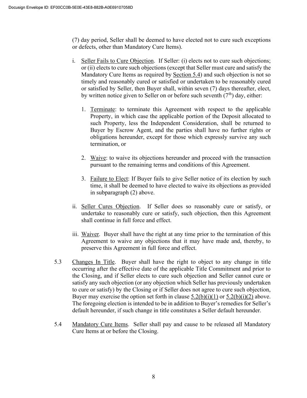 8 (7) day period, Seller shall be deemed to have elected not to cure such exceptions or defects, other than Mandatory Cure Items). i. Seller Fails to Cure Objection. If Seller: (i) elects not to cure such objections; or (ii) elects to cure such objections (except that Seller must cure and satisfy the Mandatory Cure Items as required by Section 5.4) and such objection is not so timely and reasonably cured or satisfied or undertaken to be reasonably cured or satisfied by Seller, then Buyer shall, within seven (7) days thereafter, elect, by written notice given to Seller on or before such seventh (7th) day, either: 1. Terminate: to terminate this Agreement with respect to the applicable Property, in which case the applicable portion of the Deposit allocated to such Property, less the Independent Consideration, shall be returned to Buyer by Escrow Agent, and the parties shall have no further rights or obligations hereunder, except for those which expressly survive any such termination, or 2. Waive: to waive its objections hereunder and proceed with the transaction pursuant to the remaining terms and conditions of this Agreement. 3. Failure to Elect: If Buyer fails to give Seller notice of its election by such time, it shall be deemed to have elected to waive its objections as provided in subparagraph (2) above. ii. Seller Cures Objection. If Seller does so reasonably cure or satisfy, or undertake to reasonably cure or satisfy, such objection, then this Agreement shall continue in full force and effect. iii. Waiver. Buyer shall have the right at any time prior to the termination of this Agreement to waive any objections that it may have made and, thereby, to preserve this Agreement in full force and effect. 5.3 Changes In Title. Buyer shall have the right to object to any change in title occurring after the effective date of the applicable Title Commitment and prior to the Closing, and if Seller elects to cure such objection and Seller cannot cure or satisfy any such objection (or any objection which Seller has previously undertaken to cure or satisfy) by the Closing or if Seller does not agree to cure such objection, Buyer may exercise the option set forth in clause 5.2(b)(i)(1) or 5.2(b)(i)(2) above. The foregoing election is intended to be in addition to Buyer’s remedies for Seller’s default hereunder, if such change in title constitutes a Seller default hereunder. 5.4 Mandatory Cure Items. Seller shall pay and cause to be released all Mandatory Cure Items at or before the Closing.