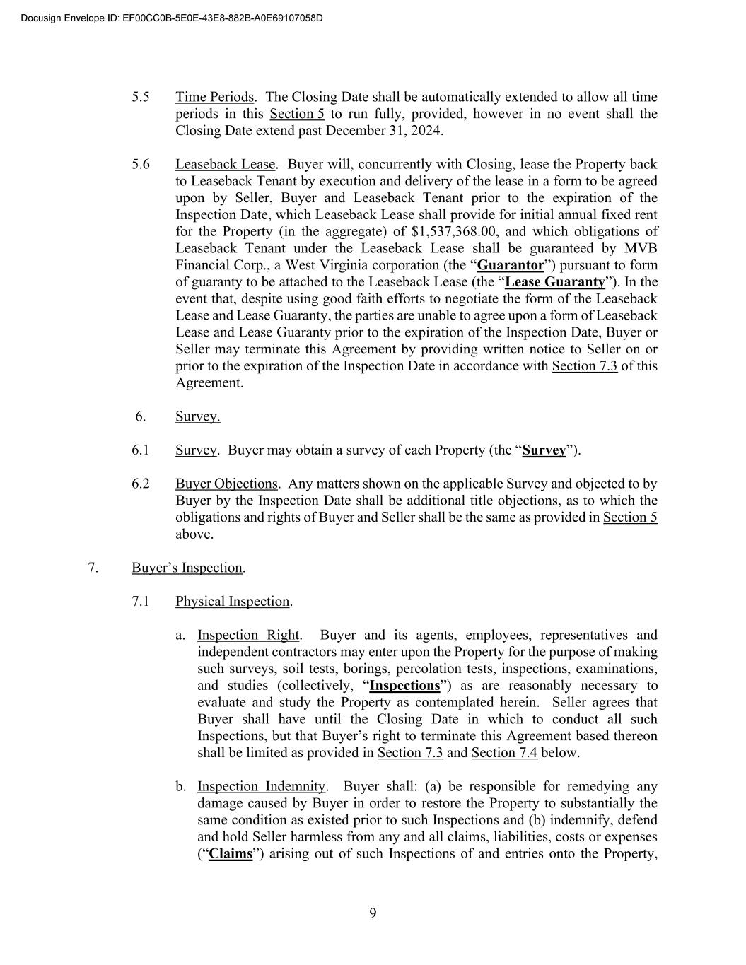 9 5.5 Time Periods. The Closing Date shall be automatically extended to allow all time periods in this Section 5 to run fully, provided, however in no event shall the Closing Date extend past December 31, 2024. 5.6 Leaseback Lease. Buyer will, concurrently with Closing, lease the Property back to Leaseback Tenant by execution and delivery of the lease in a form to be agreed upon by Seller, Buyer and Leaseback Tenant prior to the expiration of the Inspection Date, which Leaseback Lease shall provide for initial annual fixed rent for the Property (in the aggregate) of $1,537,368.00, and which obligations of Leaseback Tenant under the Leaseback Lease shall be guaranteed by MVB Financial Corp., a West Virginia corporation (the “Guarantor”) pursuant to form of guaranty to be attached to the Leaseback Lease (the “Lease Guaranty”). In the event that, despite using good faith efforts to negotiate the form of the Leaseback Lease and Lease Guaranty, the parties are unable to agree upon a form of Leaseback Lease and Lease Guaranty prior to the expiration of the Inspection Date, Buyer or Seller may terminate this Agreement by providing written notice to Seller on or prior to the expiration of the Inspection Date in accordance with Section 7.3 of this Agreement. 6. Survey. 6.1 Survey. Buyer may obtain a survey of each Property (the “Survey”). 6.2 Buyer Objections. Any matters shown on the applicable Survey and objected to by Buyer by the Inspection Date shall be additional title objections, as to which the obligations and rights of Buyer and Seller shall be the same as provided in Section 5 above. 7. Buyer’s Inspection. 7.1 Physical Inspection. a. Inspection Right. Buyer and its agents, employees, representatives and independent contractors may enter upon the Property for the purpose of making such surveys, soil tests, borings, percolation tests, inspections, examinations, and studies (collectively, “Inspections”) as are reasonably necessary to evaluate and study the Property as contemplated herein. Seller agrees that Buyer shall have until the Closing Date in which to conduct all such Inspections, but that Buyer’s right to terminate this Agreement based thereon shall be limited as provided in Section 7.3 and Section 7.4 below. b. Inspection Indemnity. Buyer shall: (a) be responsible for remedying any damage caused by Buyer in order to restore the Property to substantially the same condition as existed prior to such Inspections and (b) indemnify, defend and hold Seller harmless from any and all claims, liabilities, costs or expenses (“Claims”) arising out of such Inspections of and entries onto the Property,