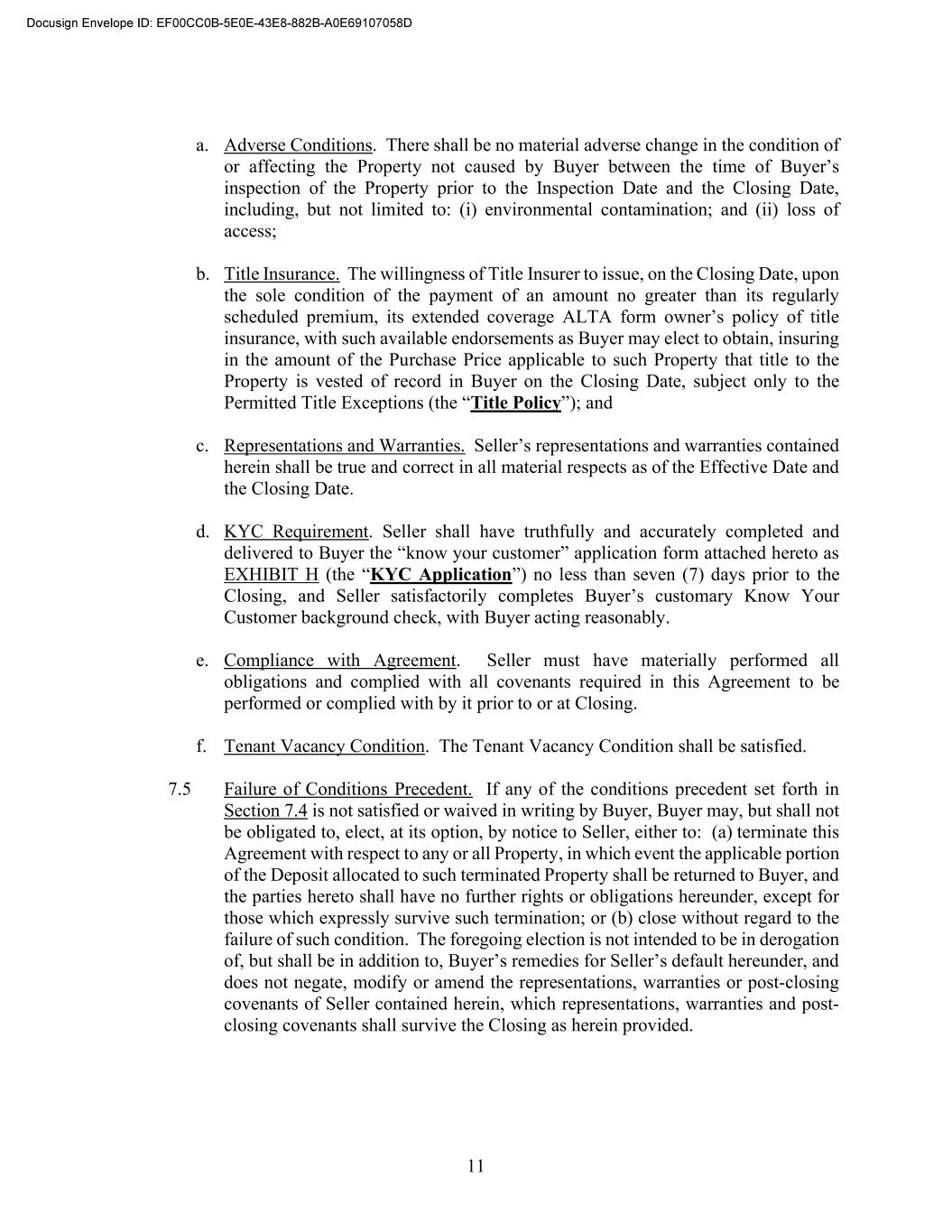 11 a. Adverse Conditions. There shall be no material adverse change in the condition of or affecting the Property not caused by Buyer between the time of Buyer’s inspection of the Property prior to the Inspection Date and the Closing Date, including, but not limited to: (i) environmental contamination; and (ii) loss of access; b. Title Insurance. The willingness of Title Insurer to issue, on the Closing Date, upon the sole condition of the payment of an amount no greater than its regularly scheduled premium, its extended coverage ALTA form owner’s policy of title insurance, with such available endorsements as Buyer may elect to obtain, insuring in the amount of the Purchase Price applicable to such Property that title to the Property is vested of record in Buyer on the Closing Date, subject only to the Permitted Title Exceptions (the “Title Policy”); and c. Representations and Warranties. Seller’s representations and warranties contained herein shall be true and correct in all material respects as of the Effective Date and the Closing Date. d. KYC Requirement. Seller shall have truthfully and accurately completed and delivered to Buyer the “know your customer” application form attached hereto as EXHIBIT H (the “KYC Application”) no less than seven (7) days prior to the Closing, and Seller satisfactorily completes Buyer’s customary Know Your Customer background check, with Buyer acting reasonably. e. Compliance with Agreement. Seller must have materially performed all obligations and complied with all covenants required in this Agreement to be performed or complied with by it prior to or at Closing. f. Tenant Vacancy Condition. The Tenant Vacancy Condition shall be satisfied. 7.5 Failure of Conditions Precedent. If any of the conditions precedent set forth in Section 7.4 is not satisfied or waived in writing by Buyer, Buyer may, but shall not be obligated to, elect, at its option, by notice to Seller, either to: (a) terminate this Agreement with respect to any or all Property, in which event the applicable portion of the Deposit allocated to such terminated Property shall be returned to Buyer, and the parties hereto shall have no further rights or obligations hereunder, except for those which expressly survive such termination; or (b) close without regard to the failure of such condition. The foregoing election is not intended to be in derogation of, but shall be in addition to, Buyer’s remedies for Seller’s default hereunder, and does not negate, modify or amend the representations, warranties or post-closing covenants of Seller contained herein, which representations, warranties and post- closing covenants shall survive the Closing as herein provided.