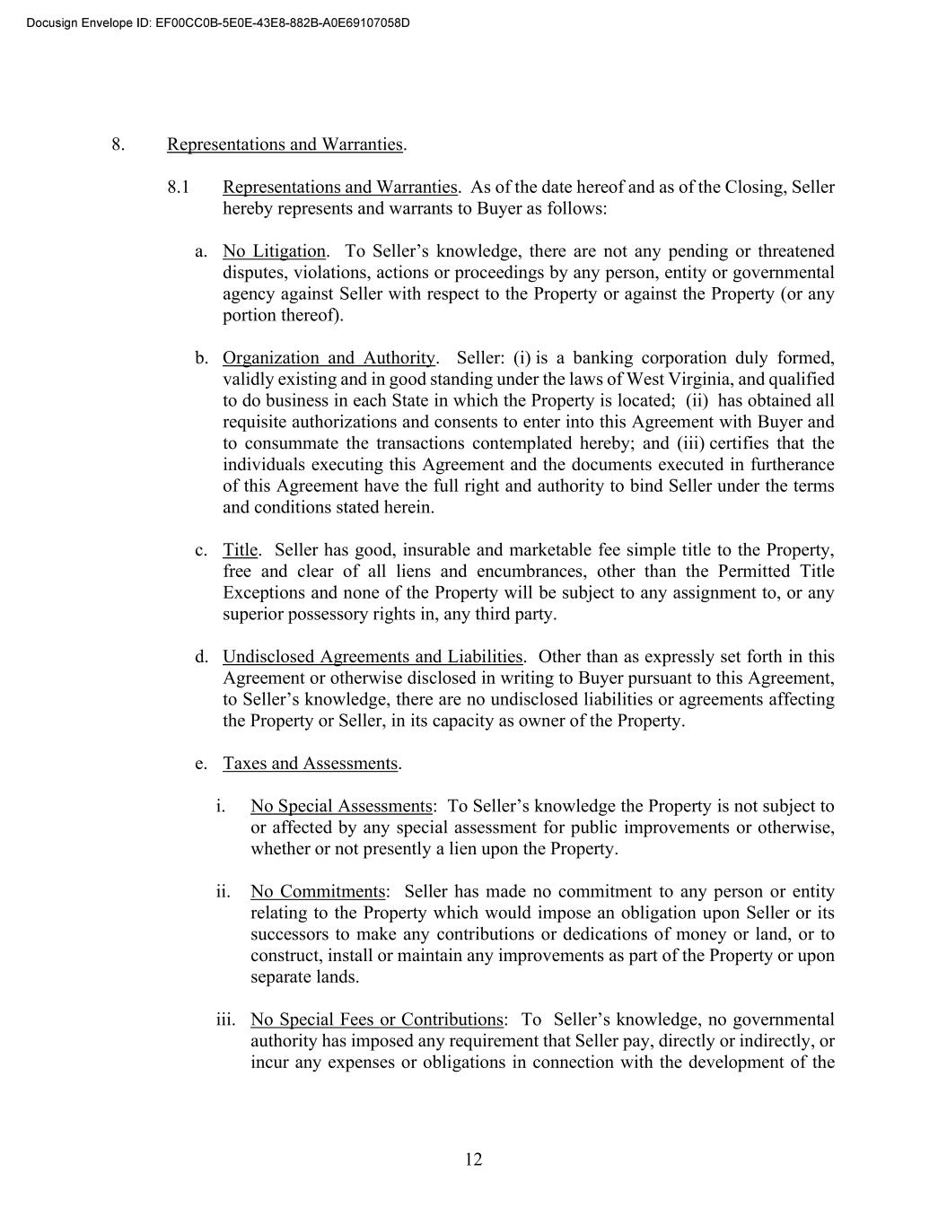 12 8. Representations and Warranties. 8.1 Representations and Warranties. As of the date hereof and as of the Closing, Seller hereby represents and warrants to Buyer as follows: a. No Litigation. To Seller’s knowledge, there are not any pending or threatened disputes, violations, actions or proceedings by any person, entity or governmental agency against Seller with respect to the Property or against the Property (or any portion thereof). b. Organization and Authority. Seller: (i) is a banking corporation duly formed, validly existing and in good standing under the laws of West Virginia, and qualified to do business in each State in which the Property is located; (ii) has obtained all requisite authorizations and consents to enter into this Agreement with Buyer and to consummate the transactions contemplated hereby; and (iii) certifies that the individuals executing this Agreement and the documents executed in furtherance of this Agreement have the full right and authority to bind Seller under the terms and conditions stated herein. c. Title. Seller has good, insurable and marketable fee simple title to the Property, free and clear of all liens and encumbrances, other than the Permitted Title Exceptions and none of the Property will be subject to any assignment to, or any superior possessory rights in, any third party. d. Undisclosed Agreements and Liabilities. Other than as expressly set forth in this Agreement or otherwise disclosed in writing to Buyer pursuant to this Agreement, to Seller’s knowledge, there are no undisclosed liabilities or agreements affecting the Property or Seller, in its capacity as owner of the Property. e. Taxes and Assessments. i. No Special Assessments: To Seller’s knowledge the Property is not subject to or affected by any special assessment for public improvements or otherwise, whether or not presently a lien upon the Property. ii. No Commitments: Seller has made no commitment to any person or entity relating to the Property which would impose an obligation upon Seller or its successors to make any contributions or dedications of money or land, or to construct, install or maintain any improvements as part of the Property or upon separate lands. iii. No Special Fees or Contributions: To Seller’s knowledge, no governmental authority has imposed any requirement that Seller pay, directly or indirectly, or incur any expenses or obligations in connection with the development of the