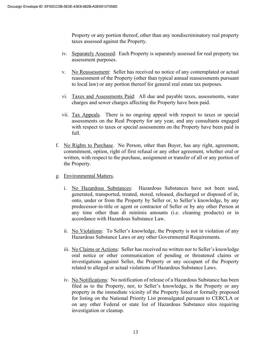 13 Property or any portion thereof, other than any nondiscriminatory real property taxes assessed against the Property. iv. Separately Assessed: Each Property is separately assessed for real property tax assessment purposes. v. No Reassessment: Seller has received no notice of any contemplated or actual reassessment of the Property (other than typical annual reassessments pursuant to local law) or any portion thereof for general real estate tax purposes. vi. Taxes and Assessments Paid: All due and payable taxes, assessments, water charges and sewer charges affecting the Property have been paid. vii. Tax Appeals. There is no ongoing appeal with respect to taxes or special assessments on the Real Property for any year, and any consultants engaged with respect to taxes or special assessments on the Property have been paid in full. f. No Rights to Purchase. No Person, other than Buyer, has any right, agreement, commitment, option, right of first refusal or any other agreement, whether oral or written, with respect to the purchase, assignment or transfer of all or any portion of the Property. g. Environmental Matters. i. No Hazardous Substances: Hazardous Substances have not been used, generated, transported, treated, stored, released, discharged or disposed of in, onto, under or from the Property by Seller or, to Seller’s knowledge, by any predecessor-in-title or agent or contractor of Seller or by any other Person at any time other than di minimis amounts (i.e. cleaning products) or in accordance with Hazardous Substance Law. ii. No Violations: To Seller’s knowledge, the Property is not in violation of any Hazardous Substance Laws or any other Governmental Requirements. iii. No Claims or Actions: Seller has received no written nor to Seller’s knowledge oral notice or other communication of pending or threatened claims or investigations against Seller, the Property or any occupant of the Property related to alleged or actual violations of Hazardous Substance Laws. iv. No Notifications: No notification of release of a Hazardous Substance has been filed as to the Property, nor, to Seller’s knowledge, is the Property or any property in the immediate vicinity of the Property listed or formally proposed for listing on the National Priority List promulgated pursuant to CERCLA or on any other Federal or state list of Hazardous Substance sites requiring investigation or cleanup.