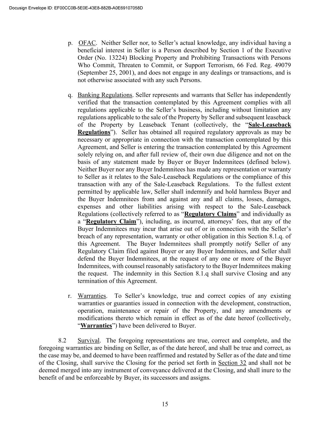 15 p. OFAC. Neither Seller nor, to Seller’s actual knowledge, any individual having a beneficial interest in Seller is a Person described by Section 1 of the Executive Order (No. 13224) Blocking Property and Prohibiting Transactions with Persons Who Commit, Threaten to Commit, or Support Terrorism, 66 Fed. Reg. 49079 (September 25, 2001), and does not engage in any dealings or transactions, and is not otherwise associated with any such Persons. q. Banking Regulations. Seller represents and warrants that Seller has independently verified that the transaction contemplated by this Agreement complies with all regulations applicable to the Seller’s business, including without limitation any regulations applicable to the sale of the Property by Seller and subsequent leaseback of the Property by Leaseback Tenant (collectively, the “Sale-Leaseback Regulations”). Seller has obtained all required regulatory approvals as may be necessary or appropriate in connection with the transaction contemplated by this Agreement, and Seller is entering the transaction contemplated by this Agreement solely relying on, and after full review of, their own due diligence and not on the basis of any statement made by Buyer or Buyer Indemnitees (defined below). Neither Buyer nor any Buyer Indemnitees has made any representation or warranty to Seller as it relates to the Sale-Leaseback Regulations or the compliance of this transaction with any of the Sale-Leaseback Regulations. To the fullest extent permitted by applicable law, Seller shall indemnify and hold harmless Buyer and the Buyer Indemnitees from and against any and all claims, losses, damages, expenses and other liabilities arising with respect to the Sale-Leaseback Regulations (collectively referred to as “Regulatory Claims” and individually as a “Regulatory Claim”), including, as incurred, attorneys’ fees, that any of the Buyer Indemnitees may incur that arise out of or in connection with the Seller’s breach of any representation, warranty or other obligation in this Section 8.1.q. of this Agreement. The Buyer Indemnitees shall promptly notify Seller of any Regulatory Claim filed against Buyer or any Buyer Indemnitees, and Seller shall defend the Buyer Indemnitees, at the request of any one or more of the Buyer Indemnitees, with counsel reasonably satisfactory to the Buyer Indemnitees making the request. The indemnity in this Section 8.1.q shall survive Closing and any termination of this Agreement. r. Warranties. To Seller’s knowledge, true and correct copies of any existing warranties or guaranties issued in connection with the development, construction, operation, maintenance or repair of the Property, and any amendments or modifications thereto which remain in effect as of the date hereof (collectively, “Warranties”) have been delivered to Buyer. 8.2 Survival. The foregoing representations are true, correct and complete, and the foregoing warranties are binding on Seller, as of the date hereof, and shall be true and correct, as the case may be, and deemed to have been reaffirmed and restated by Seller as of the date and time of the Closing, shall survive the Closing for the period set forth in Section 32 and shall not be deemed merged into any instrument of conveyance delivered at the Closing, and shall inure to the benefit of and be enforceable by Buyer, its successors and assigns.