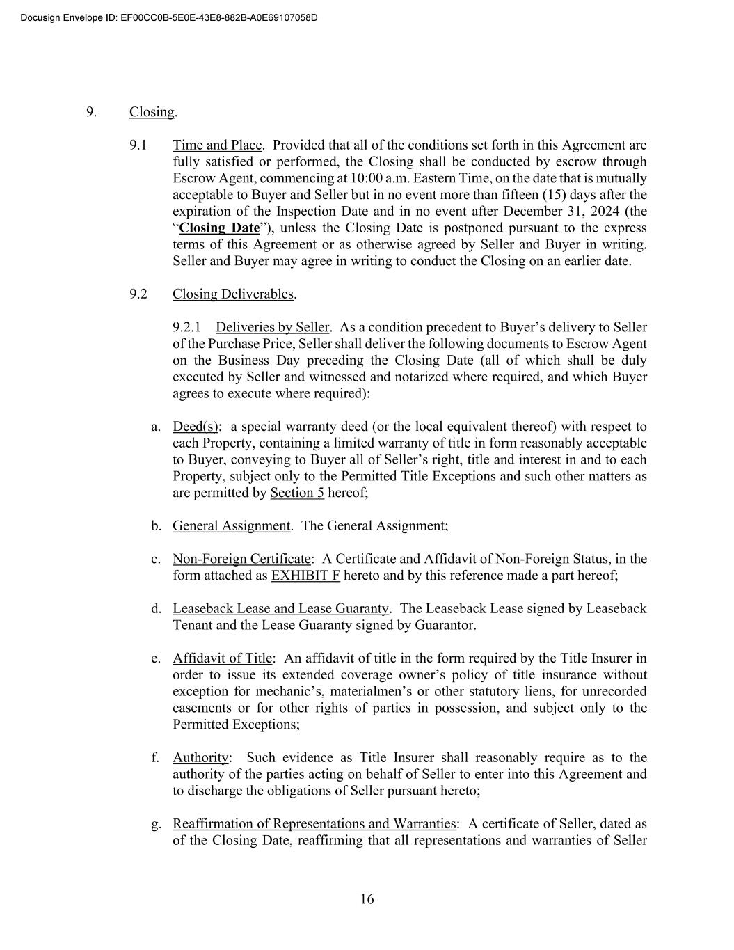 16 9. Closing. 9.1 Time and Place. Provided that all of the conditions set forth in this Agreement are fully satisfied or performed, the Closing shall be conducted by escrow through Escrow Agent, commencing at 10:00 a.m. Eastern Time, on the date that is mutually acceptable to Buyer and Seller but in no event more than fifteen (15) days after the expiration of the Inspection Date and in no event after December 31, 2024 (the “Closing Date”), unless the Closing Date is postponed pursuant to the express terms of this Agreement or as otherwise agreed by Seller and Buyer in writing. Seller and Buyer may agree in writing to conduct the Closing on an earlier date. 9.2 Closing Deliverables. 9.2.1 Deliveries by Seller. As a condition precedent to Buyer’s delivery to Seller of the Purchase Price, Seller shall deliver the following documents to Escrow Agent on the Business Day preceding the Closing Date (all of which shall be duly executed by Seller and witnessed and notarized where required, and which Buyer agrees to execute where required): a. Deed(s): a special warranty deed (or the local equivalent thereof) with respect to each Property, containing a limited warranty of title in form reasonably acceptable to Buyer, conveying to Buyer all of Seller’s right, title and interest in and to each Property, subject only to the Permitted Title Exceptions and such other matters as are permitted by Section 5 hereof; b. General Assignment. The General Assignment; c. Non-Foreign Certificate: A Certificate and Affidavit of Non-Foreign Status, in the form attached as EXHIBIT F hereto and by this reference made a part hereof; d. Leaseback Lease and Lease Guaranty. The Leaseback Lease signed by Leaseback Tenant and the Lease Guaranty signed by Guarantor. e. Affidavit of Title: An affidavit of title in the form required by the Title Insurer in order to issue its extended coverage owner’s policy of title insurance without exception for mechanic’s, materialmen’s or other statutory liens, for unrecorded easements or for other rights of parties in possession, and subject only to the Permitted Exceptions; f. Authority: Such evidence as Title Insurer shall reasonably require as to the authority of the parties acting on behalf of Seller to enter into this Agreement and to discharge the obligations of Seller pursuant hereto; g. Reaffirmation of Representations and Warranties: A certificate of Seller, dated as of the Closing Date, reaffirming that all representations and warranties of Seller