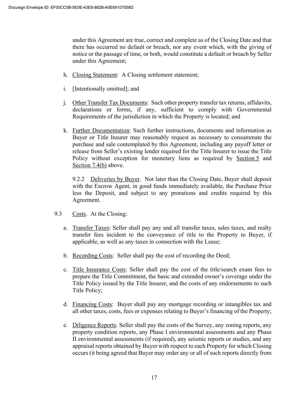 17 under this Agreement are true, correct and complete as of the Closing Date and that there has occurred no default or breach, nor any event which, with the giving of notice or the passage of time, or both, would constitute a default or breach by Seller under this Agreement; h. Closing Statement: A Closing settlement statement; i. [Intentionally omitted]; and j. Other Transfer Tax Documents: Such other property transfer tax returns, affidavits, declarations or forms, if any, sufficient to comply with Governmental Requirements of the jurisdiction in which the Property is located; and k. Further Documentation: Such further instructions, documents and information as Buyer or Title Insurer may reasonably request as necessary to consummate the purchase and sale contemplated by this Agreement, including any payoff letter or release from Seller’s existing lender required for the Title Insurer to issue the Title Policy without exception for monetary liens as required by Section 5 and Section 7.4(b) above. 9.2.2 Deliveries by Buyer. Not later than the Closing Date, Buyer shall deposit with the Escrow Agent, in good funds immediately available, the Purchase Price less the Deposit, and subject to any prorations and credits required by this Agreement. 9.3 Costs. At the Closing: a. Transfer Taxes: Seller shall pay any and all transfer taxes, sales taxes, and realty transfer fees incident to the conveyance of title to the Property to Buyer, if applicable, as well as any taxes in connection with the Lease; b. Recording Costs: Seller shall pay the cost of recording the Deed; c. Title Insurance Costs: Seller shall pay the cost of the title/search exam fees to prepare the Title Commitment, the basic and extended owner’s coverage under the Title Policy issued by the Title Insurer, and the costs of any endorsements to such Title Policy; d. Financing Costs: Buyer shall pay any mortgage recording or intangibles tax and all other taxes, costs, fees or expenses relating to Buyer’s financing of the Property; e. Diligence Reports: Seller shall pay the costs of the Survey, any zoning reports, any property condition reports, any Phase I environmental assessments and any Phase II environmental assessments (if required), any seismic reports or studies, and any appraisal reports obtained by Buyer with respect to each Property for which Closing occurs (it being agreed that Buyer may order any or all of such reports directly from
