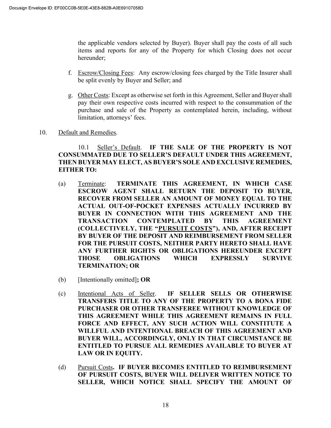 18 the applicable vendors selected by Buyer). Buyer shall pay the costs of all such items and reports for any of the Property for which Closing does not occur hereunder; f. Escrow/Closing Fees: Any escrow/closing fees charged by the Title Insurer shall be split evenly by Buyer and Seller; and g. Other Costs: Except as otherwise set forth in this Agreement, Seller and Buyer shall pay their own respective costs incurred with respect to the consummation of the purchase and sale of the Property as contemplated herein, including, without limitation, attorneys’ fees. 10. Default and Remedies. 10.1 Seller’s Default. IF THE SALE OF THE PROPERTY IS NOT CONSUMMATED DUE TO SELLER’S DEFAULT UNDER THIS AGREEMENT, THEN BUYER MAY ELECT, AS BUYER’S SOLE AND EXCLUSIVE REMEDIES, EITHER TO: (a) Terminate: TERMINATE THIS AGREEMENT, IN WHICH CASE ESCROW AGENT SHALL RETURN THE DEPOSIT TO BUYER, RECOVER FROM SELLER AN AMOUNT OF MONEY EQUAL TO THE ACTUAL OUT-OF-POCKET EXPENSES ACTUALLY INCURRED BY BUYER IN CONNECTION WITH THIS AGREEMENT AND THE TRANSACTION CONTEMPLATED BY THIS AGREEMENT (COLLECTIVELY, THE “PURSUIT COSTS”), AND, AFTER RECEIPT BY BUYER OF THE DEPOSIT AND REIMBURSEMENT FROM SELLER FOR THE PURSUIT COSTS, NEITHER PARTY HERETO SHALL HAVE ANY FURTHER RIGHTS OR OBLIGATIONS HEREUNDER EXCEPT THOSE OBLIGATIONS WHICH EXPRESSLY SURVIVE TERMINATION; OR (b) [Intentionally omitted]; OR (c) Intentional Acts of Seller. IF SELLER SELLS OR OTHERWISE TRANSFERS TITLE TO ANY OF THE PROPERTY TO A BONA FIDE PURCHASER OR OTHER TRANSFEREE WITHOUT KNOWLEDGE OF THIS AGREEMENT WHILE THIS AGREEMENT REMAINS IN FULL FORCE AND EFFECT, ANY SUCH ACTION WILL CONSTITUTE A WILLFUL AND INTENTIONAL BREACH OF THIS AGREEMENT AND BUYER WILL, ACCORDINGLY, ONLY IN THAT CIRCUMSTANCE BE ENTITLED TO PURSUE ALL REMEDIES AVAILABLE TO BUYER AT LAW OR IN EQUITY. (d) Pursuit Costs. IF BUYER BECOMES ENTITLED TO REIMBURSEMENT OF PURSUIT COSTS, BUYER WILL DELIVER WRITTEN NOTICE TO SELLER, WHICH NOTICE SHALL SPECIFY THE AMOUNT OF