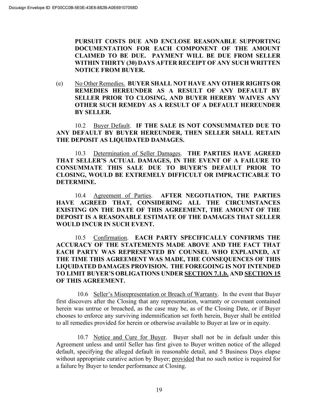 19 PURSUIT COSTS DUE AND ENCLOSE REASONABLE SUPPORTING DOCUMENTATION FOR EACH COMPONENT OF THE AMOUNT CLAIMED TO BE DUE. PAYMENT WILL BE DUE FROM SELLER WITHIN THIRTY (30) DAYS AFTER RECEIPT OF ANY SUCH WRITTEN NOTICE FROM BUYER. (e) No Other Remedies. BUYER SHALL NOT HAVE ANY OTHER RIGHTS OR REMEDIES HEREUNDER AS A RESULT OF ANY DEFAULT BY SELLER PRIOR TO CLOSING, AND BUYER HEREBY WAIVES ANY OTHER SUCH REMEDY AS A RESULT OF A DEFAULT HEREUNDER BY SELLER. 10.2 Buyer Default. IF THE SALE IS NOT CONSUMMATED DUE TO ANY DEFAULT BY BUYER HEREUNDER, THEN SELLER SHALL RETAIN THE DEPOSIT AS LIQUIDATED DAMAGES. 10.3 Determination of Seller Damages. THE PARTIES HAVE AGREED THAT SELLER’S ACTUAL DAMAGES, IN THE EVENT OF A FAILURE TO CONSUMMATE THIS SALE DUE TO BUYER’S DEFAULT PRIOR TO CLOSING, WOULD BE EXTREMELY DIFFICULT OR IMPRACTICABLE TO DETERMINE. 10.4 Agreement of Parties. AFTER NEGOTIATION, THE PARTIES HAVE AGREED THAT, CONSIDERING ALL THE CIRCUMSTANCES EXISTING ON THE DATE OF THIS AGREEMENT, THE AMOUNT OF THE DEPOSIT IS A REASONABLE ESTIMATE OF THE DAMAGES THAT SELLER WOULD INCUR IN SUCH EVENT. 10.5 Confirmation. EACH PARTY SPECIFICALLY CONFIRMS THE ACCURACY OF THE STATEMENTS MADE ABOVE AND THE FACT THAT EACH PARTY WAS REPRESENTED BY COUNSEL WHO EXPLAINED, AT THE TIME THIS AGREEMENT WAS MADE, THE CONSEQUENCES OF THIS LIQUIDATED DAMAGES PROVISION. THE FOREGOING IS NOT INTENDED TO LIMIT BUYER’S OBLIGATIONS UNDER SECTION 7.1.b. AND SECTION 15 OF THIS AGREEMENT. 10.6 Seller’s Misrepresentation or Breach of Warranty. In the event that Buyer first discovers after the Closing that any representation, warranty or covenant contained herein was untrue or breached, as the case may be, as of the Closing Date, or if Buyer chooses to enforce any surviving indemnification set forth herein, Buyer shall be entitled to all remedies provided for herein or otherwise available to Buyer at law or in equity. 10.7 Notice and Cure for Buyer. Buyer shall not be in default under this Agreement unless and until Seller has first given to Buyer written notice of the alleged default, specifying the alleged default in reasonable detail, and 5 Business Days elapse without appropriate curative action by Buyer; provided that no such notice is required for a failure by Buyer to tender performance at Closing.
