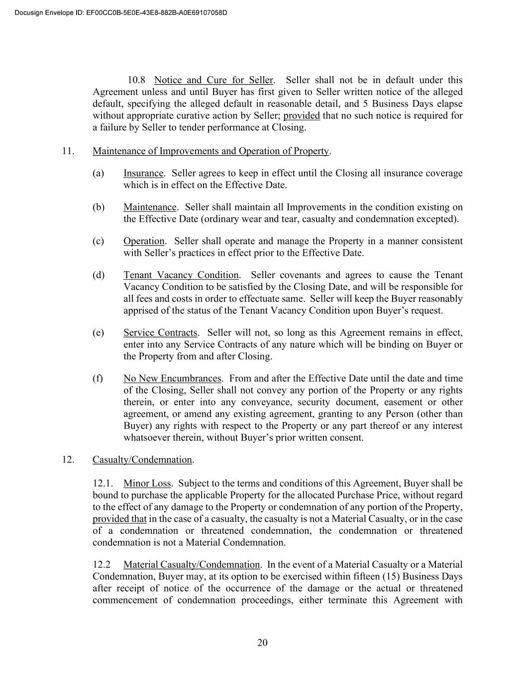 20 10.8 Notice and Cure for Seller. Seller shall not be in default under this Agreement unless and until Buyer has first given to Seller written notice of the alleged default, specifying the alleged default in reasonable detail, and 5 Business Days elapse without appropriate curative action by Seller; provided that no such notice is required for a failure by Seller to tender performance at Closing. 11. Maintenance of Improvements and Operation of Property. (a) Insurance. Seller agrees to keep in effect until the Closing all insurance coverage which is in effect on the Effective Date. (b) Maintenance. Seller shall maintain all Improvements in the condition existing on the Effective Date (ordinary wear and tear, casualty and condemnation excepted). (c) Operation. Seller shall operate and manage the Property in a manner consistent with Seller’s practices in effect prior to the Effective Date. (d) Tenant Vacancy Condition. Seller covenants and agrees to cause the Tenant Vacancy Condition to be satisfied by the Closing Date, and will be responsible for all fees and costs in order to effectuate same. Seller will keep the Buyer reasonably apprised of the status of the Tenant Vacancy Condition upon Buyer’s request. (e) Service Contracts. Seller will not, so long as this Agreement remains in effect, enter into any Service Contracts of any nature which will be binding on Buyer or the Property from and after Closing. (f) No New Encumbrances. From and after the Effective Date until the date and time of the Closing, Seller shall not convey any portion of the Property or any rights therein, or enter into any conveyance, security document, easement or other agreement, or amend any existing agreement, granting to any Person (other than Buyer) any rights with respect to the Property or any part thereof or any interest whatsoever therein, without Buyer’s prior written consent. 12. Casualty/Condemnation. 12.1. Minor Loss. Subject to the terms and conditions of this Agreement, Buyer shall be bound to purchase the applicable Property for the allocated Purchase Price, without regard to the effect of any damage to the Property or condemnation of any portion of the Property, provided that in the case of a casualty, the casualty is not a Material Casualty, or in the case of a condemnation or threatened condemnation, the condemnation or threatened condemnation is not a Material Condemnation. 12.2 Material Casualty/Condemnation. In the event of a Material Casualty or a Material Condemnation, Buyer may, at its option to be exercised within fifteen (15) Business Days after receipt of notice of the occurrence of the damage or the actual or threatened commencement of condemnation proceedings, either terminate this Agreement with