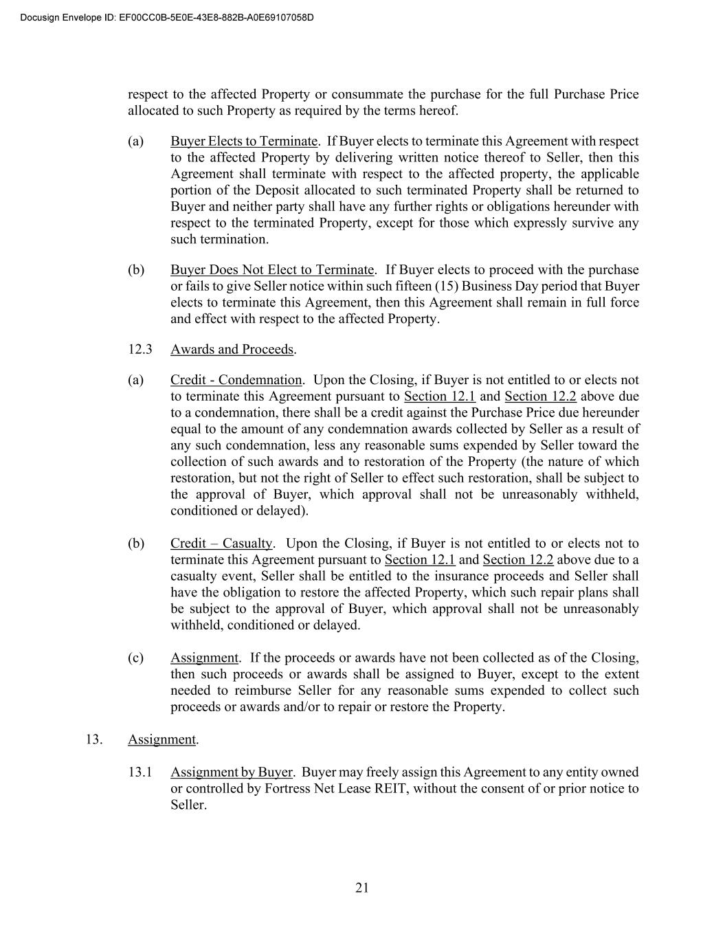 21 respect to the affected Property or consummate the purchase for the full Purchase Price allocated to such Property as required by the terms hereof. (a) Buyer Elects to Terminate. If Buyer elects to terminate this Agreement with respect to the affected Property by delivering written notice thereof to Seller, then this Agreement shall terminate with respect to the affected property, the applicable portion of the Deposit allocated to such terminated Property shall be returned to Buyer and neither party shall have any further rights or obligations hereunder with respect to the terminated Property, except for those which expressly survive any such termination. (b) Buyer Does Not Elect to Terminate. If Buyer elects to proceed with the purchase or fails to give Seller notice within such fifteen (15) Business Day period that Buyer elects to terminate this Agreement, then this Agreement shall remain in full force and effect with respect to the affected Property. 12.3 Awards and Proceeds. (a) Credit - Condemnation. Upon the Closing, if Buyer is not entitled to or elects not to terminate this Agreement pursuant to Section 12.1 and Section 12.2 above due to a condemnation, there shall be a credit against the Purchase Price due hereunder equal to the amount of any condemnation awards collected by Seller as a result of any such condemnation, less any reasonable sums expended by Seller toward the collection of such awards and to restoration of the Property (the nature of which restoration, but not the right of Seller to effect such restoration, shall be subject to the approval of Buyer, which approval shall not be unreasonably withheld, conditioned or delayed). (b) Credit – Casualty. Upon the Closing, if Buyer is not entitled to or elects not to terminate this Agreement pursuant to Section 12.1 and Section 12.2 above due to a casualty event, Seller shall be entitled to the insurance proceeds and Seller shall have the obligation to restore the affected Property, which such repair plans shall be subject to the approval of Buyer, which approval shall not be unreasonably withheld, conditioned or delayed. (c) Assignment. If the proceeds or awards have not been collected as of the Closing, then such proceeds or awards shall be assigned to Buyer, except to the extent needed to reimburse Seller for any reasonable sums expended to collect such proceeds or awards and/or to repair or restore the Property. 13. Assignment. 13.1 Assignment by Buyer. Buyer may freely assign this Agreement to any entity owned or controlled by Fortress Net Lease REIT, without the consent of or prior notice to Seller.