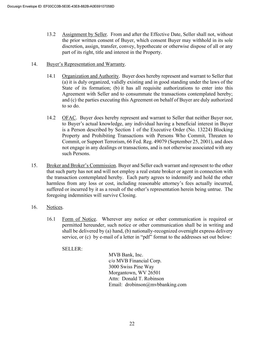22 13.2 Assignment by Seller. From and after the Effective Date, Seller shall not, without the prior written consent of Buyer, which consent Buyer may withhold in its sole discretion, assign, transfer, convey, hypothecate or otherwise dispose of all or any part of its right, title and interest in the Property. 14. Buyer’s Representation and Warranty. 14.1 Organization and Authority. Buyer does hereby represent and warrant to Seller that (a) it is duly organized, validly existing and in good standing under the laws of the State of its formation; (b) it has all requisite authorizations to enter into this Agreement with Seller and to consummate the transactions contemplated hereby; and (c) the parties executing this Agreement on behalf of Buyer are duly authorized to so do. 14.2 OFAC. Buyer does hereby represent and warrant to Seller that neither Buyer nor, to Buyer’s actual knowledge, any individual having a beneficial interest in Buyer is a Person described by Section 1 of the Executive Order (No. 13224) Blocking Property and Prohibiting Transactions with Persons Who Commit, Threaten to Commit, or Support Terrorism, 66 Fed. Reg. 49079 (September 25, 2001), and does not engage in any dealings or transactions, and is not otherwise associated with any such Persons. 15. Broker and Broker’s Commission. Buyer and Seller each warrant and represent to the other that such party has not and will not employ a real estate broker or agent in connection with the transaction contemplated hereby. Each party agrees to indemnify and hold the other harmless from any loss or cost, including reasonable attorney’s fees actually incurred, suffered or incurred by it as a result of the other’s representation herein being untrue. The foregoing indemnities will survive Closing. 16. Notices. 16.1 Form of Notice. Wherever any notice or other communication is required or permitted hereunder, such notice or other communication shall be in writing and shall be delivered by (a) hand, (b) nationally-recognized overnight express delivery service, or (c) by e-mail of a letter in “pdf” format to the addresses set out below: SELLER: MVB Bank, Inc. c/o MVB Financial Corp. 3000 Swiss Pine Way Morgantown, WV 26501 Attn: Donald T. Robinson Email: drobinson@mvbbanking.com
