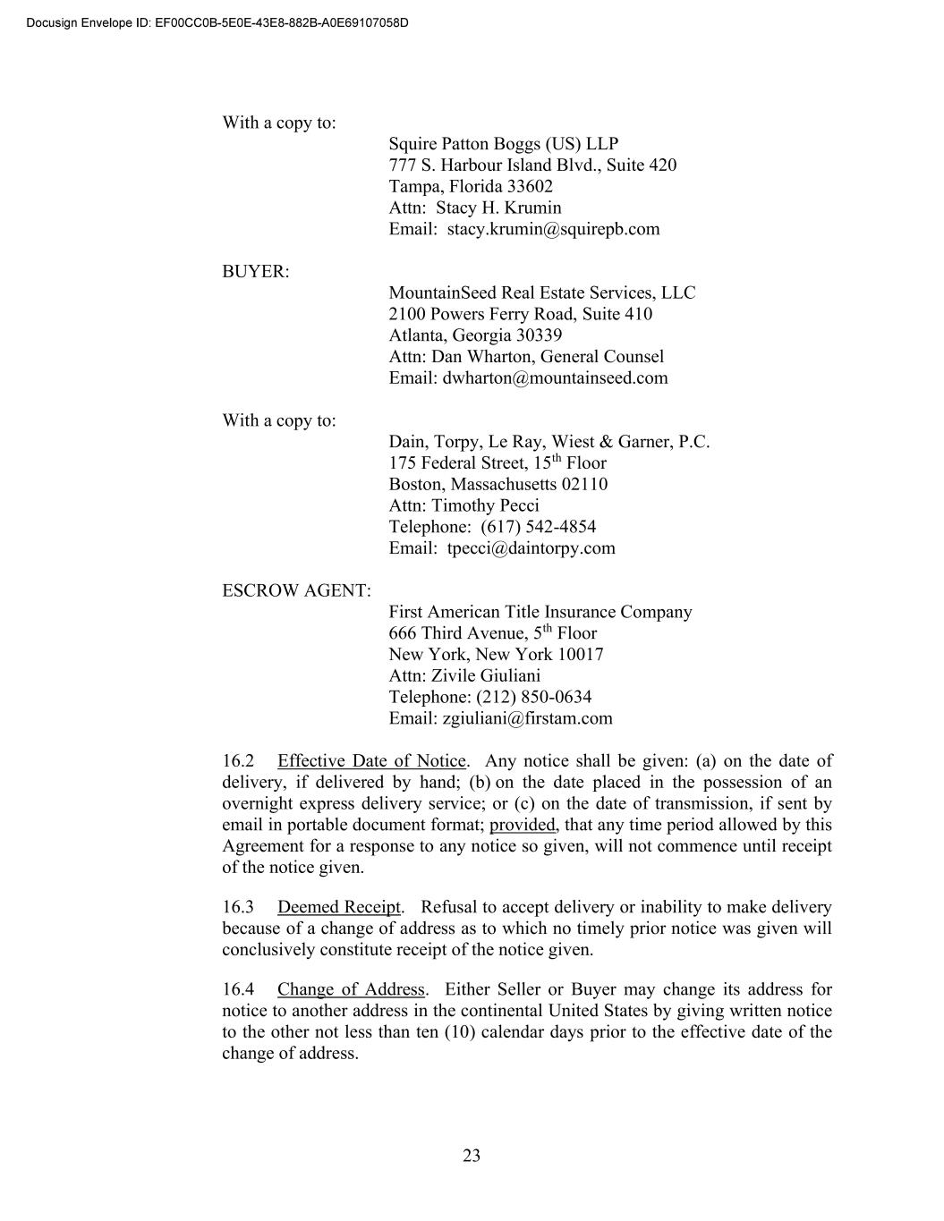23 With a copy to: Squire Patton Boggs (US) LLP 777 S. Harbour Island Blvd., Suite 420 Tampa, Florida 33602 Attn: Stacy H. Krumin Email: stacy.krumin@squirepb.com BUYER: MountainSeed Real Estate Services, LLC 2100 Powers Ferry Road, Suite 410 Atlanta, Georgia 30339 Attn: Dan Wharton, General Counsel Email: dwharton@mountainseed.com With a copy to: Dain, Torpy, Le Ray, Wiest & Garner, P.C. 175 Federal Street, 15th Floor Boston, Massachusetts 02110 Attn: Timothy Pecci Telephone: (617) 542-4854 Email: tpecci@daintorpy.com ESCROW AGENT: First American Title Insurance Company 666 Third Avenue, 5th Floor New York, New York 10017 Attn: Zivile Giuliani Telephone: (212) 850-0634 Email: zgiuliani@firstam.com 16.2 Effective Date of Notice. Any notice shall be given: (a) on the date of delivery, if delivered by hand; (b) on the date placed in the possession of an overnight express delivery service; or (c) on the date of transmission, if sent by email in portable document format; provided, that any time period allowed by this Agreement for a response to any notice so given, will not commence until receipt of the notice given. 16.3 Deemed Receipt. Refusal to accept delivery or inability to make delivery because of a change of address as to which no timely prior notice was given will conclusively constitute receipt of the notice given. 16.4 Change of Address. Either Seller or Buyer may change its address for notice to another address in the continental United States by giving written notice to the other not less than ten (10) calendar days prior to the effective date of the change of address.