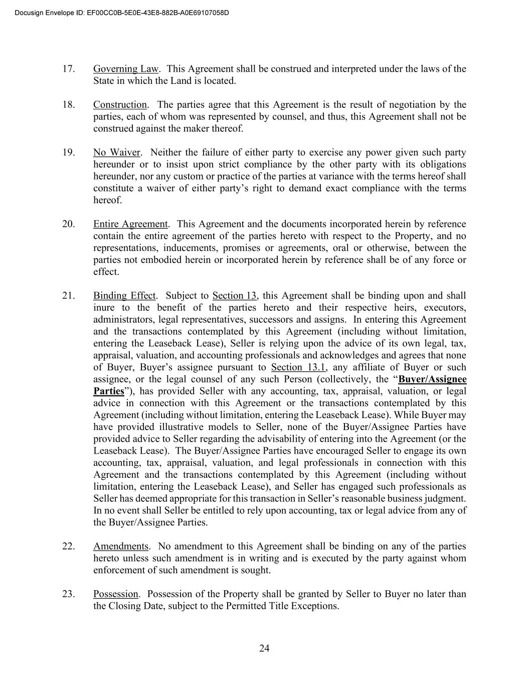 24 17. Governing Law. This Agreement shall be construed and interpreted under the laws of the State in which the Land is located. 18. Construction. The parties agree that this Agreement is the result of negotiation by the parties, each of whom was represented by counsel, and thus, this Agreement shall not be construed against the maker thereof. 19. No Waiver. Neither the failure of either party to exercise any power given such party hereunder or to insist upon strict compliance by the other party with its obligations hereunder, nor any custom or practice of the parties at variance with the terms hereof shall constitute a waiver of either party’s right to demand exact compliance with the terms hereof. 20. Entire Agreement. This Agreement and the documents incorporated herein by reference contain the entire agreement of the parties hereto with respect to the Property, and no representations, inducements, promises or agreements, oral or otherwise, between the parties not embodied herein or incorporated herein by reference shall be of any force or effect. 21. Binding Effect. Subject to Section 13, this Agreement shall be binding upon and shall inure to the benefit of the parties hereto and their respective heirs, executors, administrators, legal representatives, successors and assigns. In entering this Agreement and the transactions contemplated by this Agreement (including without limitation, entering the Leaseback Lease), Seller is relying upon the advice of its own legal, tax, appraisal, valuation, and accounting professionals and acknowledges and agrees that none of Buyer, Buyer’s assignee pursuant to Section 13.1, any affiliate of Buyer or such assignee, or the legal counsel of any such Person (collectively, the “Buyer/Assignee Parties”), has provided Seller with any accounting, tax, appraisal, valuation, or legal advice in connection with this Agreement or the transactions contemplated by this Agreement (including without limitation, entering the Leaseback Lease). While Buyer may have provided illustrative models to Seller, none of the Buyer/Assignee Parties have provided advice to Seller regarding the advisability of entering into the Agreement (or the Leaseback Lease). The Buyer/Assignee Parties have encouraged Seller to engage its own accounting, tax, appraisal, valuation, and legal professionals in connection with this Agreement and the transactions contemplated by this Agreement (including without limitation, entering the Leaseback Lease), and Seller has engaged such professionals as Seller has deemed appropriate for this transaction in Seller’s reasonable business judgment. In no event shall Seller be entitled to rely upon accounting, tax or legal advice from any of the Buyer/Assignee Parties. 22. Amendments. No amendment to this Agreement shall be binding on any of the parties hereto unless such amendment is in writing and is executed by the party against whom enforcement of such amendment is sought. 23. Possession. Possession of the Property shall be granted by Seller to Buyer no later than the Closing Date, subject to the Permitted Title Exceptions.