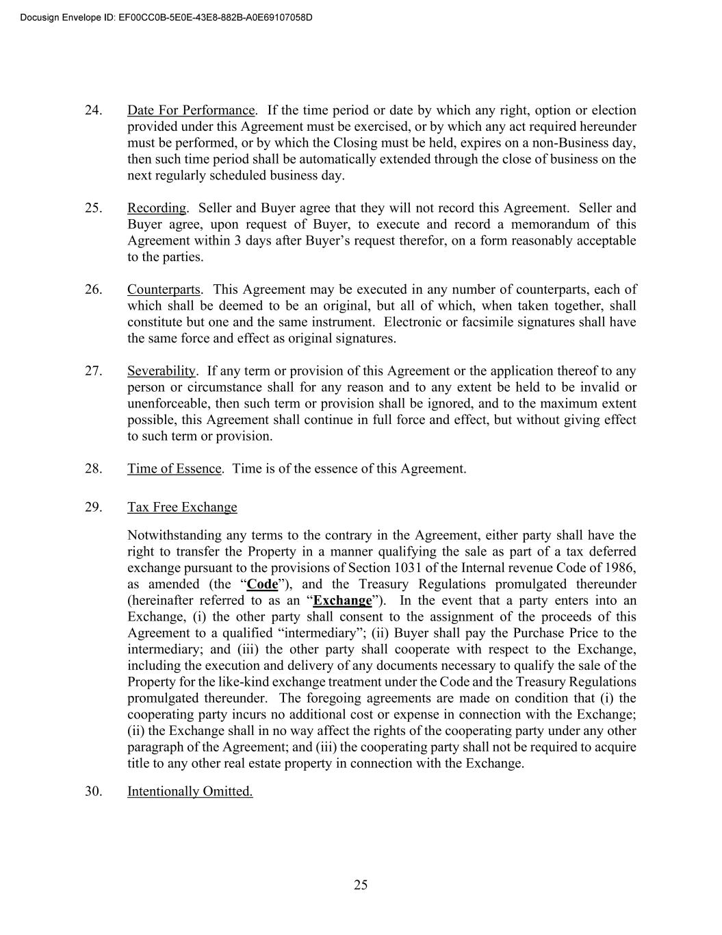 25 24. Date For Performance. If the time period or date by which any right, option or election provided under this Agreement must be exercised, or by which any act required hereunder must be performed, or by which the Closing must be held, expires on a non-Business day, then such time period shall be automatically extended through the close of business on the next regularly scheduled business day. 25. Recording. Seller and Buyer agree that they will not record this Agreement. Seller and Buyer agree, upon request of Buyer, to execute and record a memorandum of this Agreement within 3 days after Buyer’s request therefor, on a form reasonably acceptable to the parties. 26. Counterparts. This Agreement may be executed in any number of counterparts, each of which shall be deemed to be an original, but all of which, when taken together, shall constitute but one and the same instrument. Electronic or facsimile signatures shall have the same force and effect as original signatures. 27. Severability. If any term or provision of this Agreement or the application thereof to any person or circumstance shall for any reason and to any extent be held to be invalid or unenforceable, then such term or provision shall be ignored, and to the maximum extent possible, this Agreement shall continue in full force and effect, but without giving effect to such term or provision. 28. Time of Essence. Time is of the essence of this Agreement. 29. Tax Free Exchange Notwithstanding any terms to the contrary in the Agreement, either party shall have the right to transfer the Property in a manner qualifying the sale as part of a tax deferred exchange pursuant to the provisions of Section 1031 of the Internal revenue Code of 1986, as amended (the “Code”), and the Treasury Regulations promulgated thereunder (hereinafter referred to as an “Exchange”). In the event that a party enters into an Exchange, (i) the other party shall consent to the assignment of the proceeds of this Agreement to a qualified “intermediary”; (ii) Buyer shall pay the Purchase Price to the intermediary; and (iii) the other party shall cooperate with respect to the Exchange, including the execution and delivery of any documents necessary to qualify the sale of the Property for the like-kind exchange treatment under the Code and the Treasury Regulations promulgated thereunder. The foregoing agreements are made on condition that (i) the cooperating party incurs no additional cost or expense in connection with the Exchange; (ii) the Exchange shall in no way affect the rights of the cooperating party under any other paragraph of the Agreement; and (iii) the cooperating party shall not be required to acquire title to any other real estate property in connection with the Exchange. 30. Intentionally Omitted.