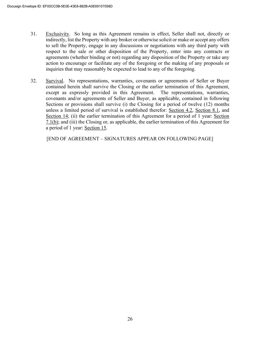 26 31. Exclusivity. So long as this Agreement remains in effect, Seller shall not, directly or indirectly, list the Property with any broker or otherwise solicit or make or accept any offers to sell the Property, engage in any discussions or negotiations with any third party with respect to the sale or other disposition of the Property, enter into any contracts or agreements (whether binding or not) regarding any disposition of the Property or take any action to encourage or facilitate any of the foregoing or the making of any proposals or inquiries that may reasonably be expected to lead to any of the foregoing. 32. Survival. No representations, warranties, covenants or agreements of Seller or Buyer contained herein shall survive the Closing or the earlier termination of this Agreement, except as expressly provided in this Agreement. The representations, warranties, covenants and/or agreements of Seller and Buyer, as applicable, contained in following Sections or provisions shall survive (i) the Closing for a period of twelve (12) months unless a limited period of survival is established therefor: Section 4.2, Section 8.1, and Section 14; (ii) the earlier termination of this Agreement for a period of 1 year: Section 7.1(b); and (iii) the Closing or, as applicable, the earlier termination of this Agreement for a period of 1 year: Section 15. [END OF AGREEMENT – SIGNATURES APPEAR ON FOLLOWING PAGE]
