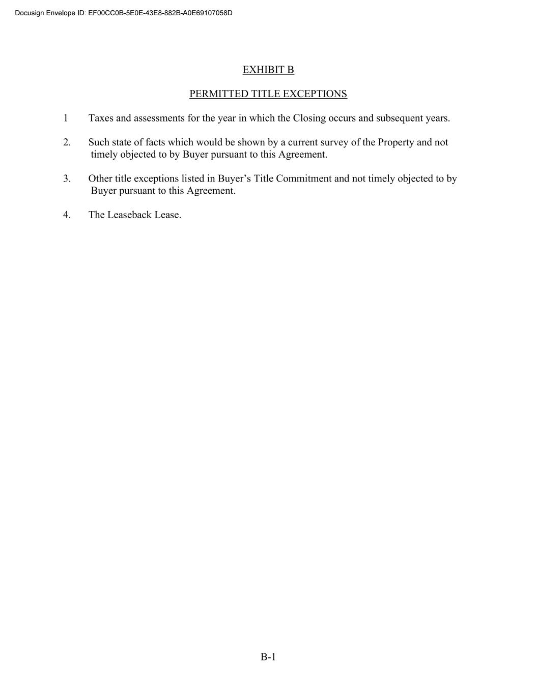 B-1 EXHIBIT B PERMITTED TITLE EXCEPTIONS 1 Taxes and assessments for the year in which the Closing occurs and subsequent years. 2. Such state of facts which would be shown by a current survey of the Property and not timely objected to by Buyer pursuant to this Agreement. 3. Other title exceptions listed in Buyer’s Title Commitment and not timely objected to by Buyer pursuant to this Agreement. 4. The Leaseback Lease.