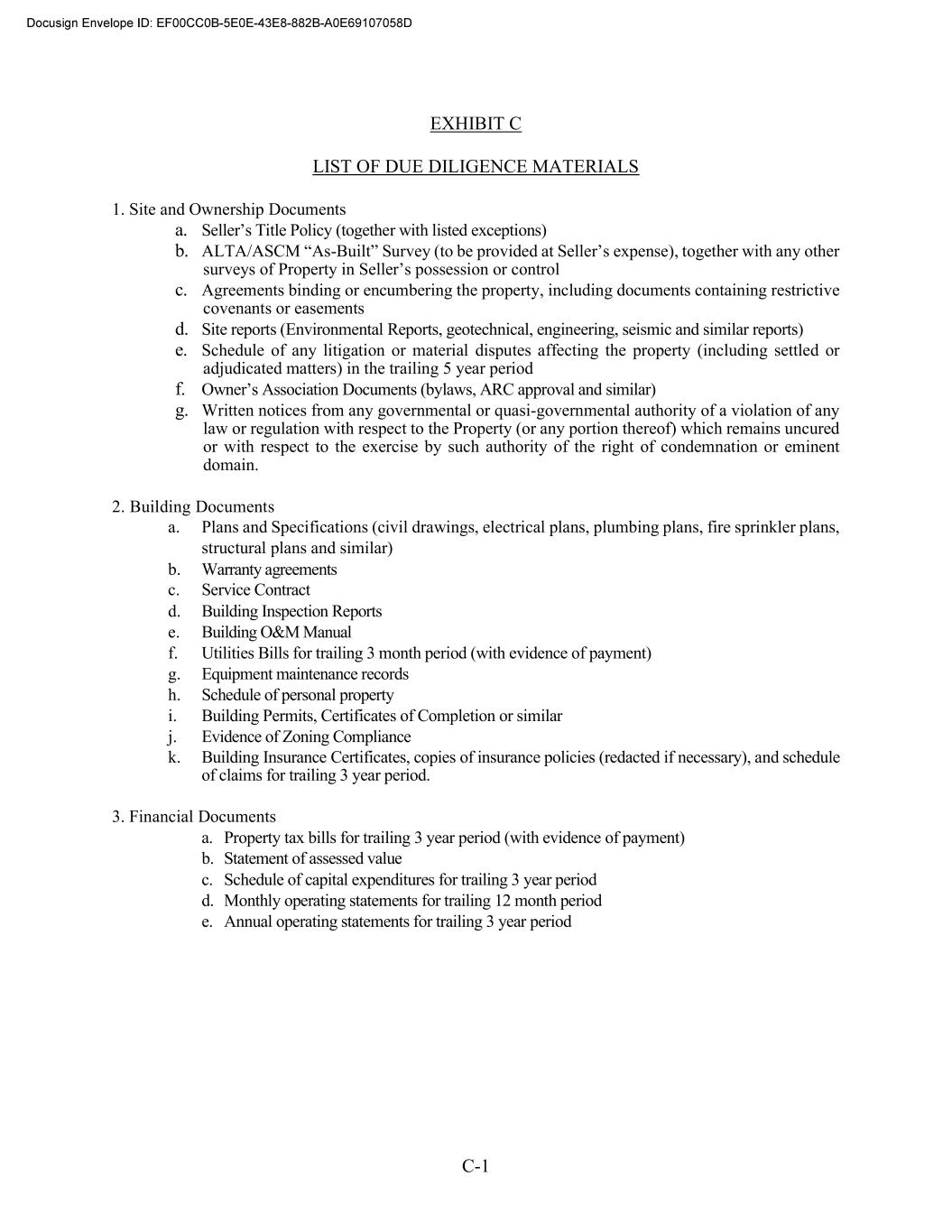 C-1 EXHIBIT C LIST OF DUE DILIGENCE MATERIALS 1. Site and Ownership Documents a. Seller’s Title Policy (together with listed exceptions) b. ALTA/ASCM “As-Built” Survey (to be provided at Seller’s expense), together with any other surveys of Property in Seller’s possession or control c. Agreements binding or encumbering the property, including documents containing restrictive covenants or easements d. Site reports (Environmental Reports, geotechnical, engineering, seismic and similar reports) e. Schedule of any litigation or material disputes affecting the property (including settled or adjudicated matters) in the trailing 5 year period f. Owner’s Association Documents (bylaws, ARC approval and similar) g. Written notices from any governmental or quasi-governmental authority of a violation of any law or regulation with respect to the Property (or any portion thereof) which remains uncured or with respect to the exercise by such authority of the right of condemnation or eminent domain. 2. Building Documents a. Plans and Specifications (civil drawings, electrical plans, plumbing plans, fire sprinkler plans, structural plans and similar) b. Warranty agreements c. Service Contract d. Building Inspection Reports e. Building O&M Manual f. Utilities Bills for trailing 3 month period (with evidence of payment) g. Equipment maintenance records h. Schedule of personal property i. Building Permits, Certificates of Completion or similar j. Evidence of Zoning Compliance k. Building Insurance Certificates, copies of insurance policies (redacted if necessary), and schedule of claims for trailing 3 year period. 3. Financial Documents a. Property tax bills for trailing 3 year period (with evidence of payment) b. Statement of assessed value c. Schedule of capital expenditures for trailing 3 year period d. Monthly operating statements for trailing 12 month period e. Annual operating statements for trailing 3 year period