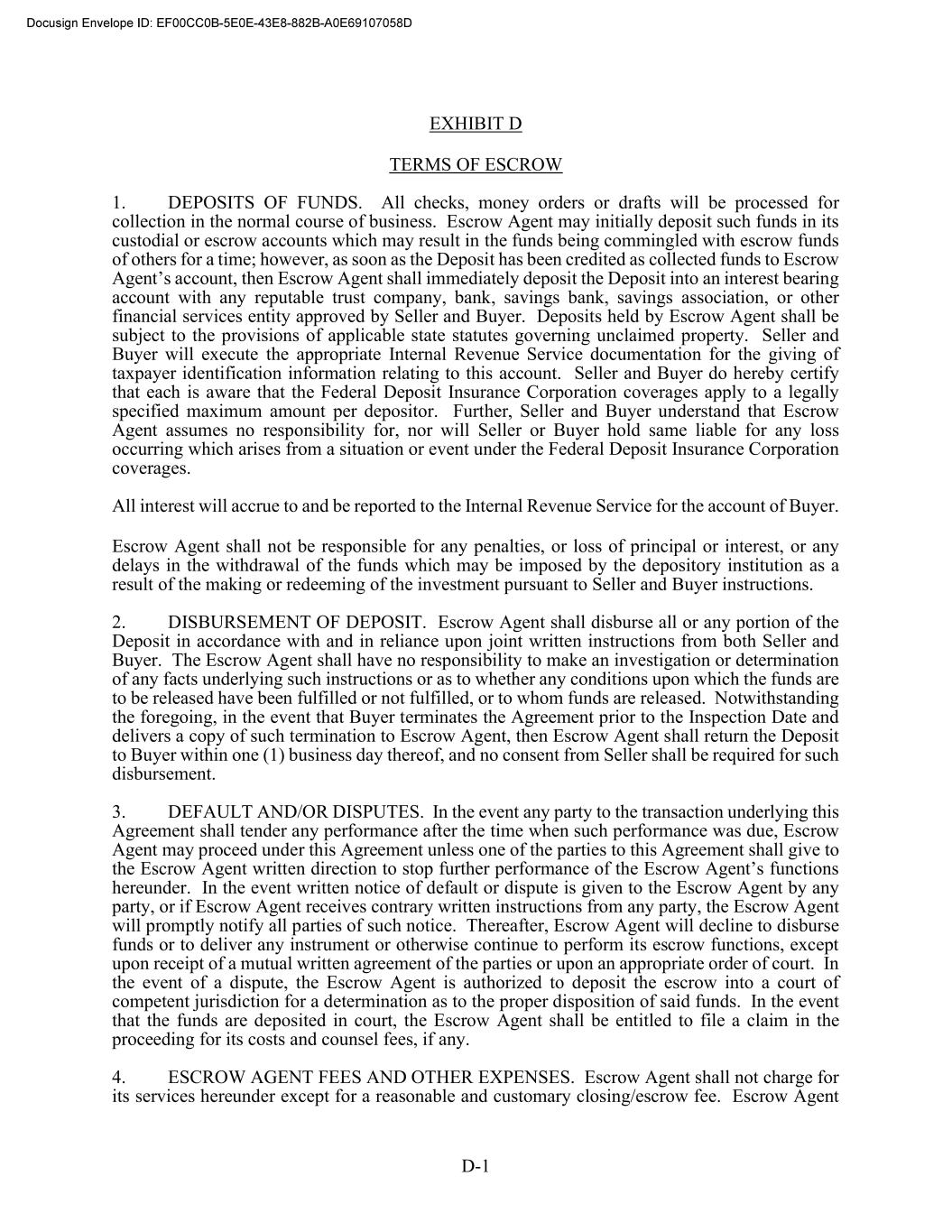 D-1 EXHIBIT D TERMS OF ESCROW 1. DEPOSITS OF FUNDS. All checks, money orders or drafts will be processed for collection in the normal course of business. Escrow Agent may initially deposit such funds in its custodial or escrow accounts which may result in the funds being commingled with escrow funds of others for a time; however, as soon as the Deposit has been credited as collected funds to Escrow Agent’s account, then Escrow Agent shall immediately deposit the Deposit into an interest bearing account with any reputable trust company, bank, savings bank, savings association, or other financial services entity approved by Seller and Buyer. Deposits held by Escrow Agent shall be subject to the provisions of applicable state statutes governing unclaimed property. Seller and Buyer will execute the appropriate Internal Revenue Service documentation for the giving of taxpayer identification information relating to this account. Seller and Buyer do hereby certify that each is aware that the Federal Deposit Insurance Corporation coverages apply to a legally specified maximum amount per depositor. Further, Seller and Buyer understand that Escrow Agent assumes no responsibility for, nor will Seller or Buyer hold same liable for any loss occurring which arises from a situation or event under the Federal Deposit Insurance Corporation coverages. All interest will accrue to and be reported to the Internal Revenue Service for the account of Buyer. Escrow Agent shall not be responsible for any penalties, or loss of principal or interest, or any delays in the withdrawal of the funds which may be imposed by the depository institution as a result of the making or redeeming of the investment pursuant to Seller and Buyer instructions. 2. DISBURSEMENT OF DEPOSIT. Escrow Agent shall disburse all or any portion of the Deposit in accordance with and in reliance upon joint written instructions from both Seller and Buyer. The Escrow Agent shall have no responsibility to make an investigation or determination of any facts underlying such instructions or as to whether any conditions upon which the funds are to be released have been fulfilled or not fulfilled, or to whom funds are released. Notwithstanding the foregoing, in the event that Buyer terminates the Agreement prior to the Inspection Date and delivers a copy of such termination to Escrow Agent, then Escrow Agent shall return the Deposit to Buyer within one (1) business day thereof, and no consent from Seller shall be required for such disbursement. 3. DEFAULT AND/OR DISPUTES. In the event any party to the transaction underlying this Agreement shall tender any performance after the time when such performance was due, Escrow Agent may proceed under this Agreement unless one of the parties to this Agreement shall give to the Escrow Agent written direction to stop further performance of the Escrow Agent’s functions hereunder. In the event written notice of default or dispute is given to the Escrow Agent by any party, or if Escrow Agent receives contrary written instructions from any party, the Escrow Agent will promptly notify all parties of such notice. Thereafter, Escrow Agent will decline to disburse funds or to deliver any instrument or otherwise continue to perform its escrow functions, except upon receipt of a mutual written agreement of the parties or upon an appropriate order of court. In the event of a dispute, the Escrow Agent is authorized to deposit the escrow into a court of competent jurisdiction for a determination as to the proper disposition of said funds. In the event that the funds are deposited in court, the Escrow Agent shall be entitled to file a claim in the proceeding for its costs and counsel fees, if any. 4. ESCROW AGENT FEES AND OTHER EXPENSES. Escrow Agent shall not charge for its services hereunder except for a reasonable and customary closing/escrow fee. Escrow Agent