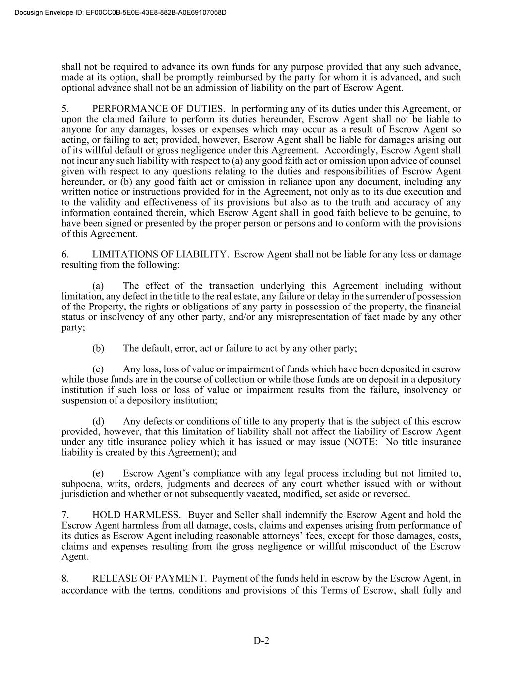 D-2 shall not be required to advance its own funds for any purpose provided that any such advance, made at its option, shall be promptly reimbursed by the party for whom it is advanced, and such optional advance shall not be an admission of liability on the part of Escrow Agent. 5. PERFORMANCE OF DUTIES. In performing any of its duties under this Agreement, or upon the claimed failure to perform its duties hereunder, Escrow Agent shall not be liable to anyone for any damages, losses or expenses which may occur as a result of Escrow Agent so acting, or failing to act; provided, however, Escrow Agent shall be liable for damages arising out of its willful default or gross negligence under this Agreement. Accordingly, Escrow Agent shall not incur any such liability with respect to (a) any good faith act or omission upon advice of counsel given with respect to any questions relating to the duties and responsibilities of Escrow Agent hereunder, or (b) any good faith act or omission in reliance upon any document, including any written notice or instructions provided for in the Agreement, not only as to its due execution and to the validity and effectiveness of its provisions but also as to the truth and accuracy of any information contained therein, which Escrow Agent shall in good faith believe to be genuine, to have been signed or presented by the proper person or persons and to conform with the provisions of this Agreement. 6. LIMITATIONS OF LIABILITY. Escrow Agent shall not be liable for any loss or damage resulting from the following: (a) The effect of the transaction underlying this Agreement including without limitation, any defect in the title to the real estate, any failure or delay in the surrender of possession of the Property, the rights or obligations of any party in possession of the property, the financial status or insolvency of any other party, and/or any misrepresentation of fact made by any other party; (b) The default, error, act or failure to act by any other party; (c) Any loss, loss of value or impairment of funds which have been deposited in escrow while those funds are in the course of collection or while those funds are on deposit in a depository institution if such loss or loss of value or impairment results from the failure, insolvency or suspension of a depository institution; (d) Any defects or conditions of title to any property that is the subject of this escrow provided, however, that this limitation of liability shall not affect the liability of Escrow Agent under any title insurance policy which it has issued or may issue (NOTE: No title insurance liability is created by this Agreement); and (e) Escrow Agent’s compliance with any legal process including but not limited to, subpoena, writs, orders, judgments and decrees of any court whether issued with or without jurisdiction and whether or not subsequently vacated, modified, set aside or reversed. 7. HOLD HARMLESS. Buyer and Seller shall indemnify the Escrow Agent and hold the Escrow Agent harmless from all damage, costs, claims and expenses arising from performance of its duties as Escrow Agent including reasonable attorneys’ fees, except for those damages, costs, claims and expenses resulting from the gross negligence or willful misconduct of the Escrow Agent. 8. RELEASE OF PAYMENT. Payment of the funds held in escrow by the Escrow Agent, in accordance with the terms, conditions and provisions of this Terms of Escrow, shall fully and