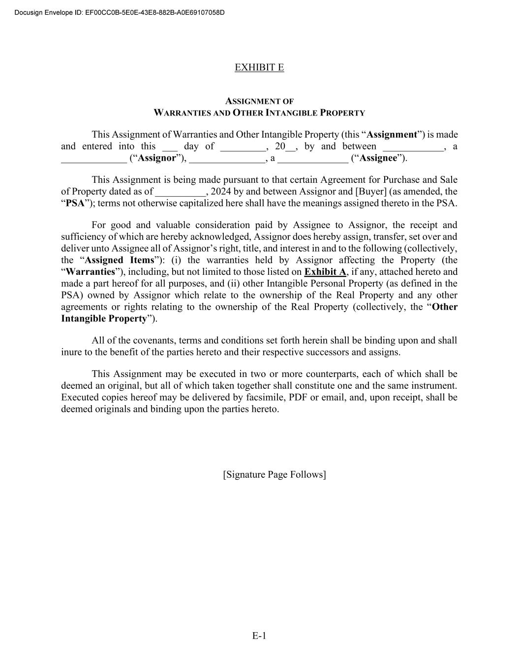 E-1 EXHIBIT E ASSIGNMENT OF WARRANTIES AND OTHER INTANGIBLE PROPERTY This Assignment of Warranties and Other Intangible Property (this “Assignment”) is made and entered into this ___ day of _________, 20__, by and between ____________, a _____________ (“Assignor”), _______________, a ______________ (“Assignee”). This Assignment is being made pursuant to that certain Agreement for Purchase and Sale of Property dated as of __________, 2024 by and between Assignor and [Buyer] (as amended, the “PSA”); terms not otherwise capitalized here shall have the meanings assigned thereto in the PSA. For good and valuable consideration paid by Assignee to Assignor, the receipt and sufficiency of which are hereby acknowledged, Assignor does hereby assign, transfer, set over and deliver unto Assignee all of Assignor’s right, title, and interest in and to the following (collectively, the “Assigned Items”): (i) the warranties held by Assignor affecting the Property (the “Warranties”), including, but not limited to those listed on Exhibit A, if any, attached hereto and made a part hereof for all purposes, and (ii) other Intangible Personal Property (as defined in the PSA) owned by Assignor which relate to the ownership of the Real Property and any other agreements or rights relating to the ownership of the Real Property (collectively, the “Other Intangible Property”). All of the covenants, terms and conditions set forth herein shall be binding upon and shall inure to the benefit of the parties hereto and their respective successors and assigns. This Assignment may be executed in two or more counterparts, each of which shall be deemed an original, but all of which taken together shall constitute one and the same instrument. Executed copies hereof may be delivered by facsimile, PDF or email, and, upon receipt, shall be deemed originals and binding upon the parties hereto. [Signature Page Follows]