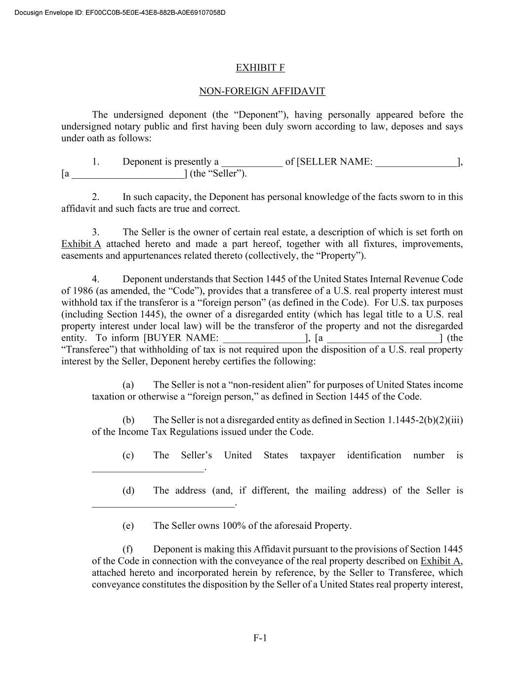 F-1 EXHIBIT F NON-FOREIGN AFFIDAVIT The undersigned deponent (the “Deponent”), having personally appeared before the undersigned notary public and first having been duly sworn according to law, deposes and says under oath as follows: 1. Deponent is presently a ____________ of [SELLER NAME: ________________], [a ______________________] (the “Seller”). 2. In such capacity, the Deponent has personal knowledge of the facts sworn to in this affidavit and such facts are true and correct. 3. The Seller is the owner of certain real estate, a description of which is set forth on Exhibit A attached hereto and made a part hereof, together with all fixtures, improvements, easements and appurtenances related thereto (collectively, the “Property”). 4. Deponent understands that Section 1445 of the United States Internal Revenue Code of 1986 (as amended, the “Code”), provides that a transferee of a U.S. real property interest must withhold tax if the transferor is a “foreign person” (as defined in the Code). For U.S. tax purposes (including Section 1445), the owner of a disregarded entity (which has legal title to a U.S. real property interest under local law) will be the transferor of the property and not the disregarded entity. To inform [BUYER NAME: ________________], [a ______________________] (the “Transferee”) that withholding of tax is not required upon the disposition of a U.S. real property interest by the Seller, Deponent hereby certifies the following: (a) The Seller is not a “non-resident alien” for purposes of United States income taxation or otherwise a “foreign person,” as defined in Section 1445 of the Code. (b) The Seller is not a disregarded entity as defined in Section 1.1445-2(b)(2)(iii) of the Income Tax Regulations issued under the Code. (c) The Seller’s United States taxpayer identification number is ______________________. (d) The address (and, if different, the mailing address) of the Seller is ____________________________. (e) The Seller owns 100% of the aforesaid Property. (f) Deponent is making this Affidavit pursuant to the provisions of Section 1445 of the Code in connection with the conveyance of the real property described on Exhibit A, attached hereto and incorporated herein by reference, by the Seller to Transferee, which conveyance constitutes the disposition by the Seller of a United States real property interest,