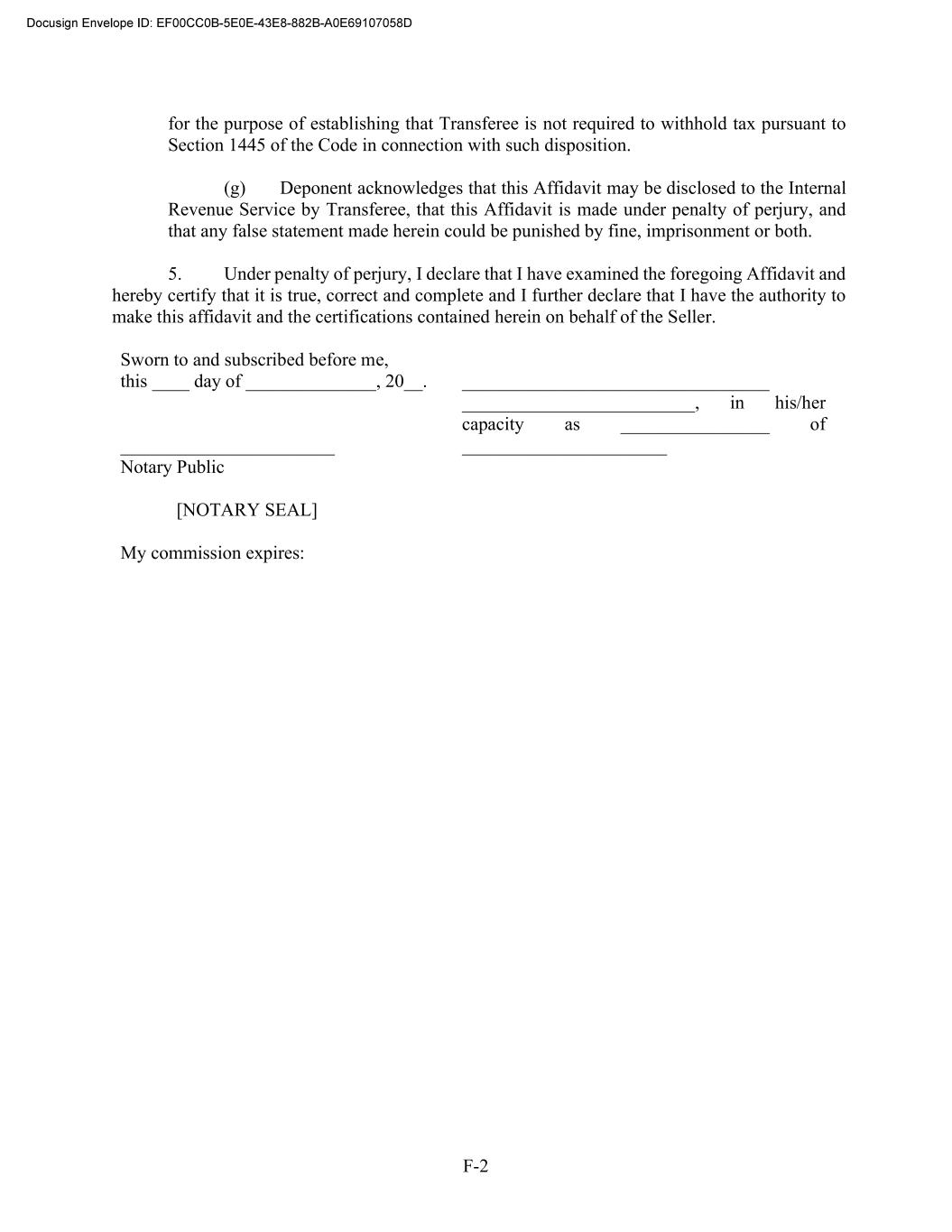 F-2 for the purpose of establishing that Transferee is not required to withhold tax pursuant to Section 1445 of the Code in connection with such disposition. (g) Deponent acknowledges that this Affidavit may be disclosed to the Internal Revenue Service by Transferee, that this Affidavit is made under penalty of perjury, and that any false statement made herein could be punished by fine, imprisonment or both. 5. Under penalty of perjury, I declare that I have examined the foregoing Affidavit and hereby certify that it is true, correct and complete and I further declare that I have the authority to make this affidavit and the certifications contained herein on behalf of the Seller. Sworn to and subscribed before me, this ____ day of ______________, 20__. _______________________ Notary Public [NOTARY SEAL] My commission expires: _________________________________ _________________________, in his/her capacity as ________________ of ______________________