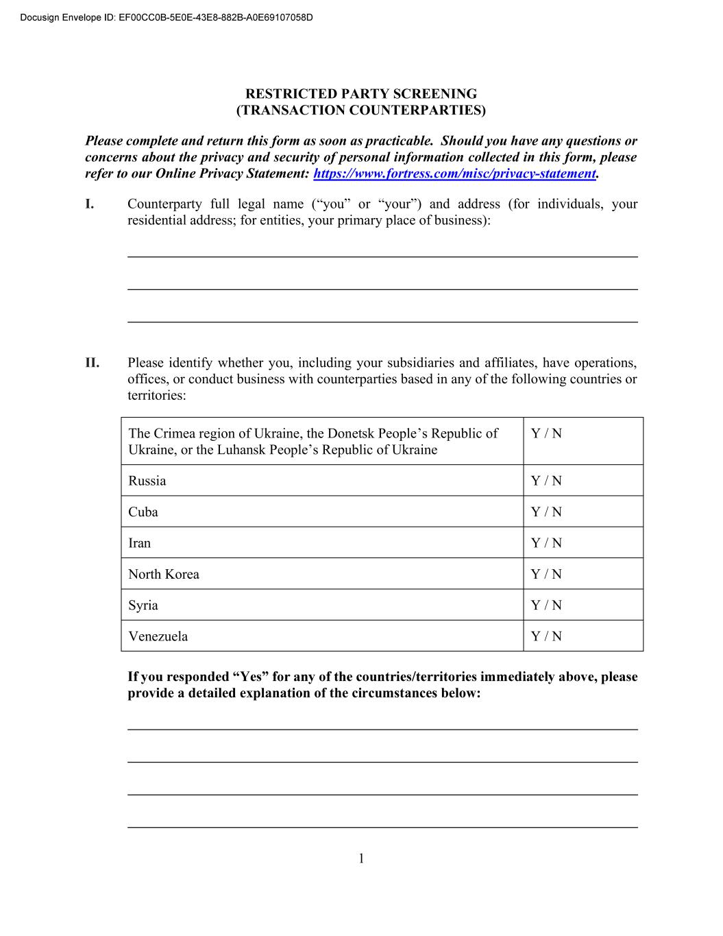 1 RESTRICTED PARTY SCREENING (TRANSACTION COUNTERPARTIES) Please complete and return this form as soon as practicable. Should you have any questions or concerns about the privacy and security of personal information collected in this form, please refer to our Online Privacy Statement: https://www.fortress.com/misc/privacy-statement. I. Counterparty full legal name ( you or your ) and address (for individuals, your residential address; for entities, your primary place of business): II. Please identify whether you, including your subsidiaries and affiliates, have operations, offices, or conduct business with counterparties based in any of the following countries or territories: The Crimea region of Ukraine, the Donetsk People s Republic of Ukraine, or the Luhansk People s Republic of Ukraine Y / N Russia Y / N Cuba Y / N Iran Y / N North Korea Y / N Syria Y / N Venezuela Y / N provide a detailed explanation of the circumstances below: