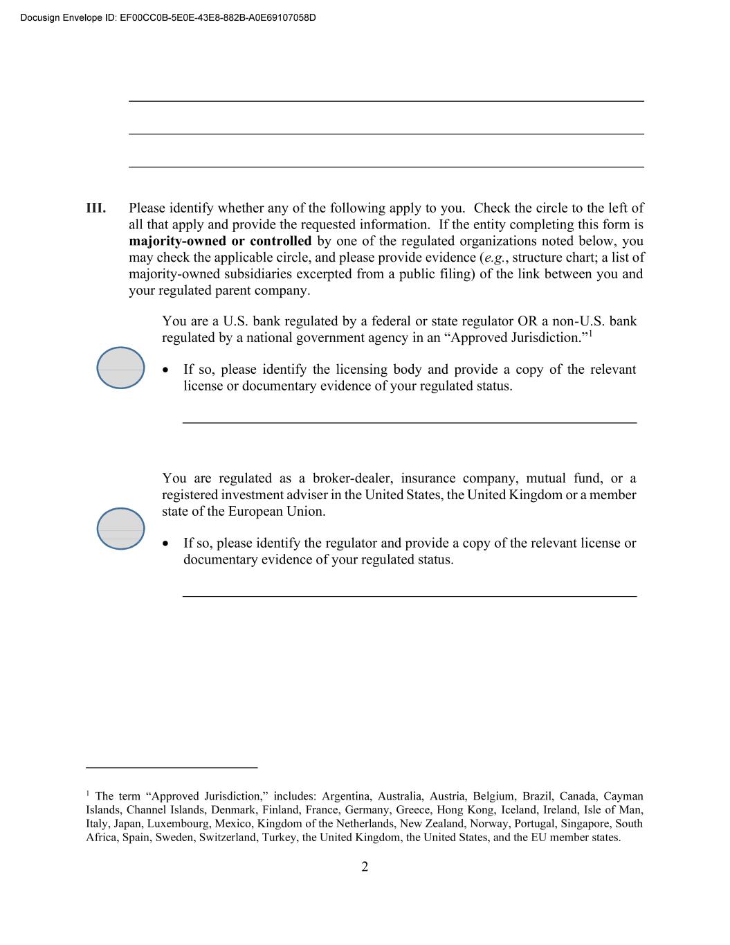2 III. Please identify whether any of the following apply to you. Check the circle to the left of all that apply and provide the requested information. If the entity completing this form is majority-owned or controlled by one of the regulated organizations noted below, you may check the applicable circle, and please provide evidence (e.g., structure chart; a list of majority-owned subsidiaries excerpted from a public filing) of the link between you and your regulated parent company. You are a U.S. bank regulated by a federal or state regulator OR a non-U.S. bank regula 1 If so, please identify the licensing body and provide a copy of the relevant license or documentary evidence of your regulated status. You are regulated as a broker-dealer, insurance company, mutual fund, or a registered investment adviser in the United States, the United Kingdom or a member state of the European Union. If so, please identify the regulator and provide a copy of the relevant license or documentary evidence of your regulated status. 1 Islands, Channel Islands, Denmark, Finland, France, Germany, Greece, Hong Kong, Iceland, Ireland, Isle of Man, Italy, Japan, Luxembourg, Mexico, Kingdom of the Netherlands, New Zealand, Norway, Portugal, Singapore, South Africa, Spain, Sweden, Switzerland, Turkey, the United Kingdom, the United States, and the EU member states.