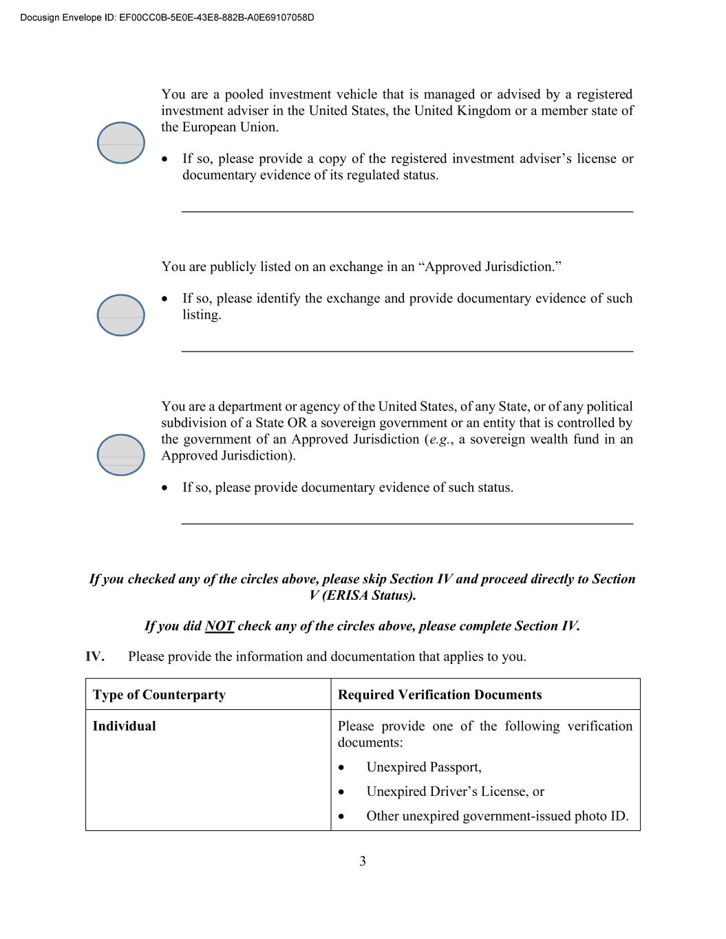 3 You are a pooled investment vehicle that is managed or advised by a registered investment adviser in the United States, the United Kingdom or a member state of the European Union. If so, please provide a copy of the registered investment adviser s license or documentary evidence of its regulated status. If so, please identify the exchange and provide documentary evidence of such listing. You are a department or agency of the United States, of any State, or of any political subdivision of a State OR a sovereign government or an entity that is controlled by the government of an Approved Jurisdiction (e.g., a sovereign wealth fund in an Approved Jurisdiction). If so, please provide documentary evidence of such status. If you checked any of the circles above, please skip Section IV and proceed directly to Section V (ERISA Status). If you did NOT check any of the circles above, please complete Section IV. IV. Please provide the information and documentation that applies to you. Type of Counterparty Required Verification Documents Individual Please provide one of the following verification documents: Unexpired Passport, Other unexpired government-issued photo ID.