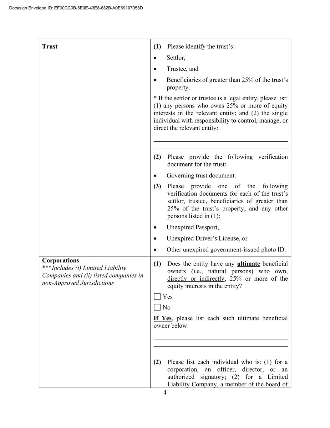 4 Trust (1) Settlor, Trustee, and property. * If the settlor or trustee is a legal entity, please list: (1) any persons who owns 25% or more of equity interests in the relevant entity; and (2) the single individual with responsibility to control, manage, or direct the relevant entity: (2) Please provide the following verification document for the trust: Governing trust document. (3) Please provide one of the following settlor, trustee, beneficiaries of greater than persons listed in (1): Unexpired Passport, Other unexpired government-issued photo ID. Corporations ***Includes (i) Limited Liability Companies and (ii) listed companies in non-Approved Jurisdictions (1) Does the entity have any ultimate beneficial owners (i.e., natural persons) who own, directly or indirectly, 25% or more of the equity interests in the entity? Yes No If Yes, please list each such ultimate beneficial owner below: (2) Please list each individual who is: (1) for a corporation, an officer, director, or an authorized signatory; (2) for a Limited Liability Company, a member of the board of