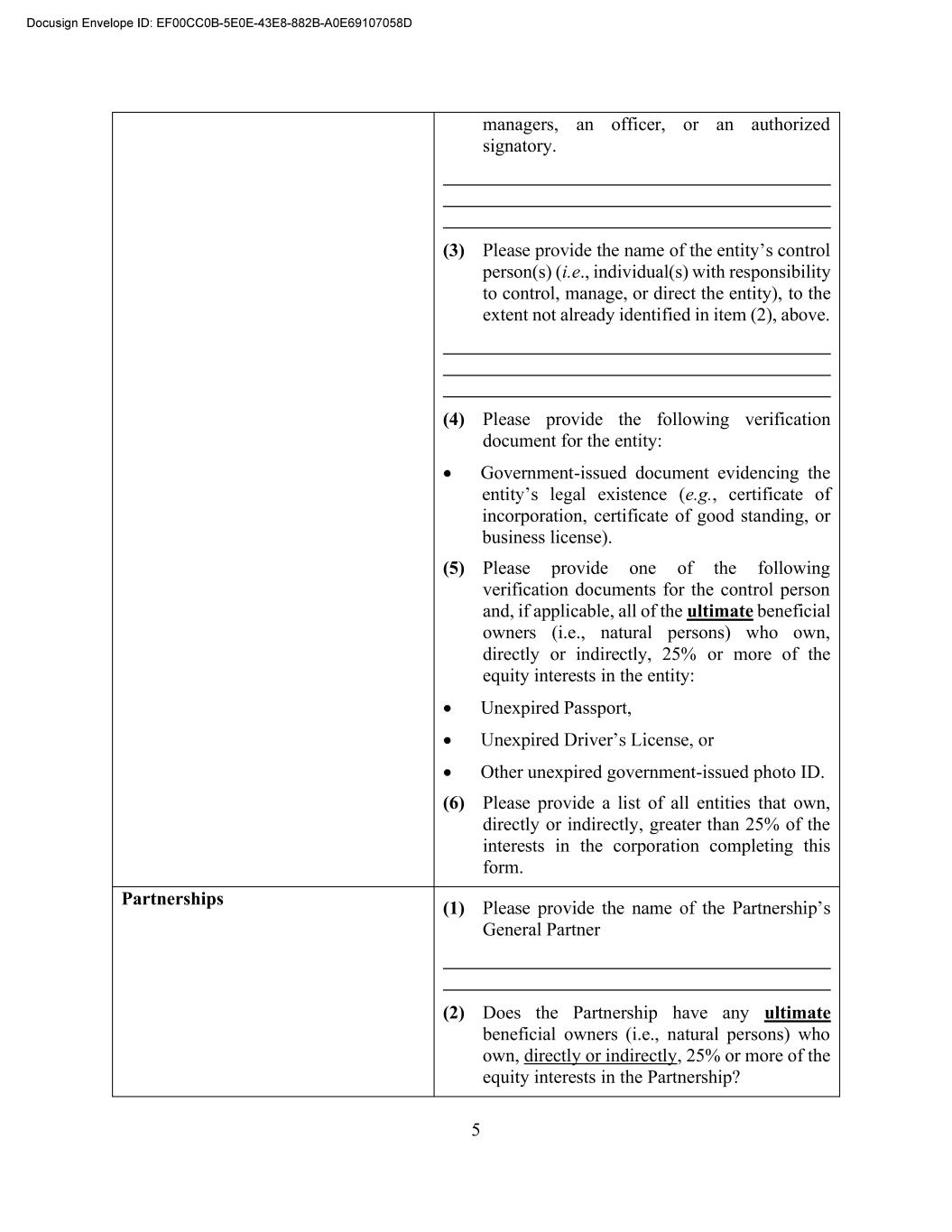 5 managers, an officer, or an authorized signatory. (3) person(s) (i.e., individual(s) with responsibility to control, manage, or direct the entity), to the extent not already identified in item (2), above. (4) Please provide the following verification document for the entity: Government-issued document evidencing the e.g., certificate of incorporation, certificate of good standing, or business license). (5) Please provide one of the following verification documents for the control person and, if applicable, all of the ultimate beneficial owners (i.e., natural persons) who own, directly or indirectly, 25% or more of the equity interests in the entity: Unexpired Passport, Other unexpired government-issued photo ID. (6) Please provide a list of all entities that own, directly or indirectly, greater than 25% of the interests in the corporation completing this form. Partnerships (1) General Partner (2) Does the Partnership have any ultimate beneficial owners (i.e., natural persons) who own, directly or indirectly, 25% or more of the equity interests in the Partnership?