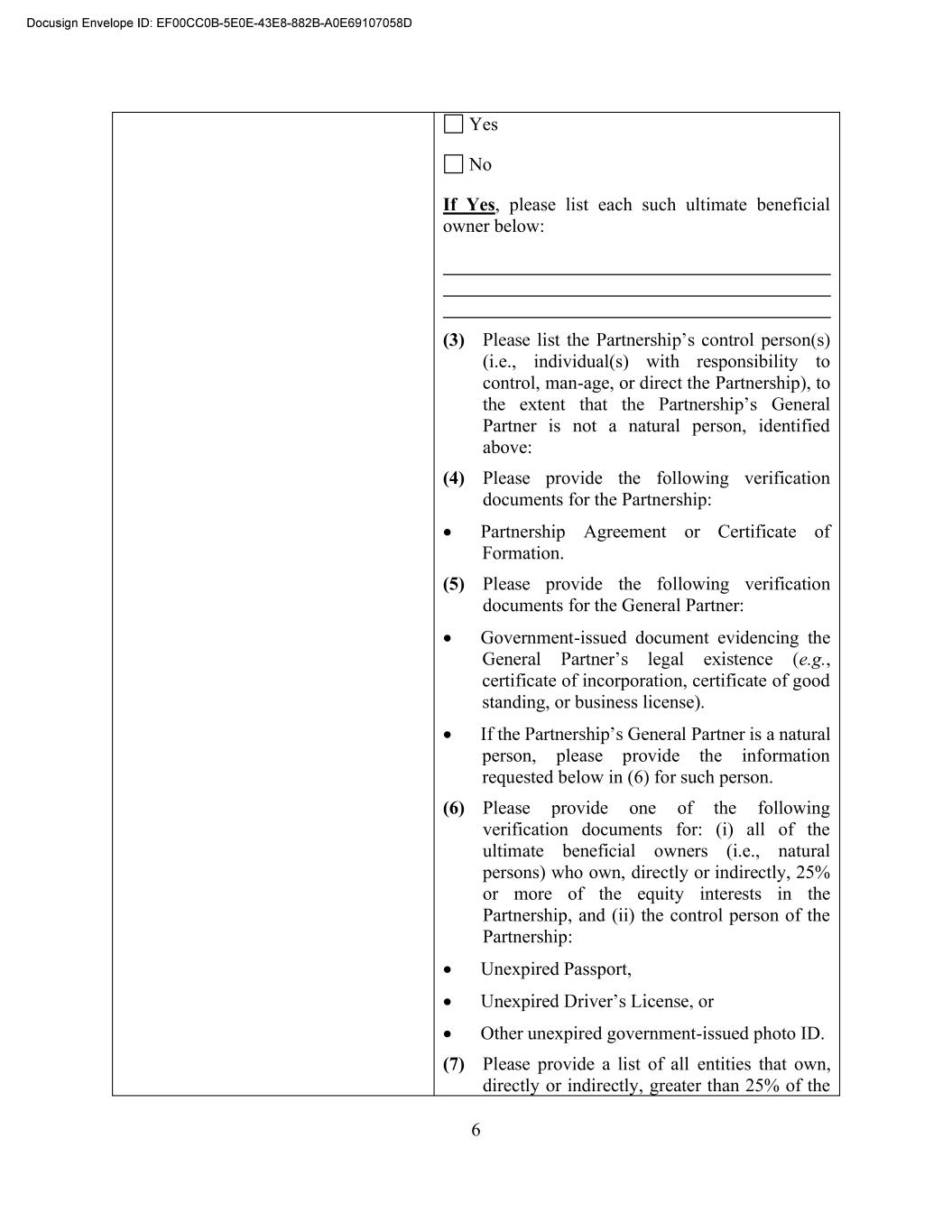 6 Yes No If Yes, please list each such ultimate beneficial owner below: (3) (i.e., individual(s) with responsibility to control, man-age, or direct the Partnership), to Partner is not a natural person, identified above: (4) Please provide the following verification documents for the Partnership: Partnership Agreement or Certificate of Formation. (5) Please provide the following verification documents for the General Partner: Government-issued document evidencing the e.g., certificate of incorporation, certificate of good standing, or business license). Partner is a natural person, please provide the information requested below in (6) for such person. (6) Please provide one of the following verification documents for: (i) all of the ultimate beneficial owners (i.e., natural persons) who own, directly or indirectly, 25% or more of the equity interests in the Partnership, and (ii) the control person of the Partnership: Unexpired Passport, Other unexpired government-issued photo ID. (7) Please provide a list of all entities that own, directly or indirectly, greater than 25% of the