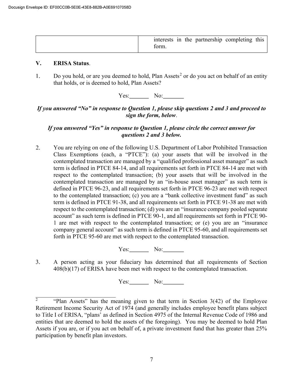 7 interests in the partnership completing this form. V. ERISA Status. Do you hold, or are you deemed to hold, Plan Assets2 or do you act on behalf of an entity that holds, or is deemed to hold, Plan Assets? Yes: No: sign the form, below. questions 2 and 3 below. You are relying on one of the following U.S. Department of Labor Prohibited Transaction Class Exemptions (each, a PTCE ): (a) your assets that will be involved in the contemplated transaction are managed by a qualified professional asset manager as such term is defined in PTCE 84-14, and all requirements set forth in PTCE 84-14 are met with respect to the contemplated transaction; (b) your assets that will be involved in the contemplated transaction are managed by an in-house asset manager as such term is defined in PTCE 96-23, and all requirements set forth in PTCE 96-23 are met with respect to the contemplated transaction; (c) you are a bank collective investment fund as such term is defined in PTCE 91-38, and all requirements set forth in PTCE 91-38 are met with respect to the contemplated transaction; (d) you are an insurance company pooled separate account as such term is defined in PTCE 90-1, and all requirements set forth in PTCE 90- 1 are met with respect to the contemplated transaction; or (e) you are an insurance company general account as such term is defined in PTCE 95-60, and all requirements set forth in PTCE 95-60 are met with respect to the contemplated transaction. Yes: No: A person acting as your fiduciary has determined that all requirements of Section 408(b)(17) of ERISA have been met with respect to the contemplated transaction. Yes: No: ___________________________ 2 Retirement Income Security Act of 1974 (and generally includes employee benefit plans subject the Internal Revenue Code of 1986 and entities that are deemed to hold the assets of the foregoing). You may be deemed to hold Plan Assets if you are, or if you act on behalf of, a private investment fund that has greater than 25% participation by benefit plan investors.