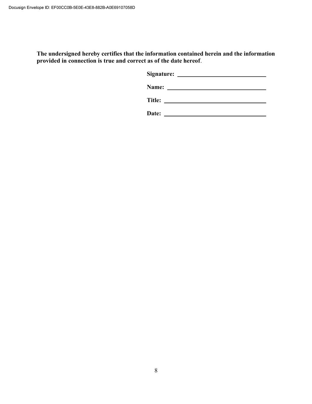 8 The undersigned hereby certifies that the information contained herein and the information provided in connection is true and correct as of the date hereof. Signature: Name: Title: Date: