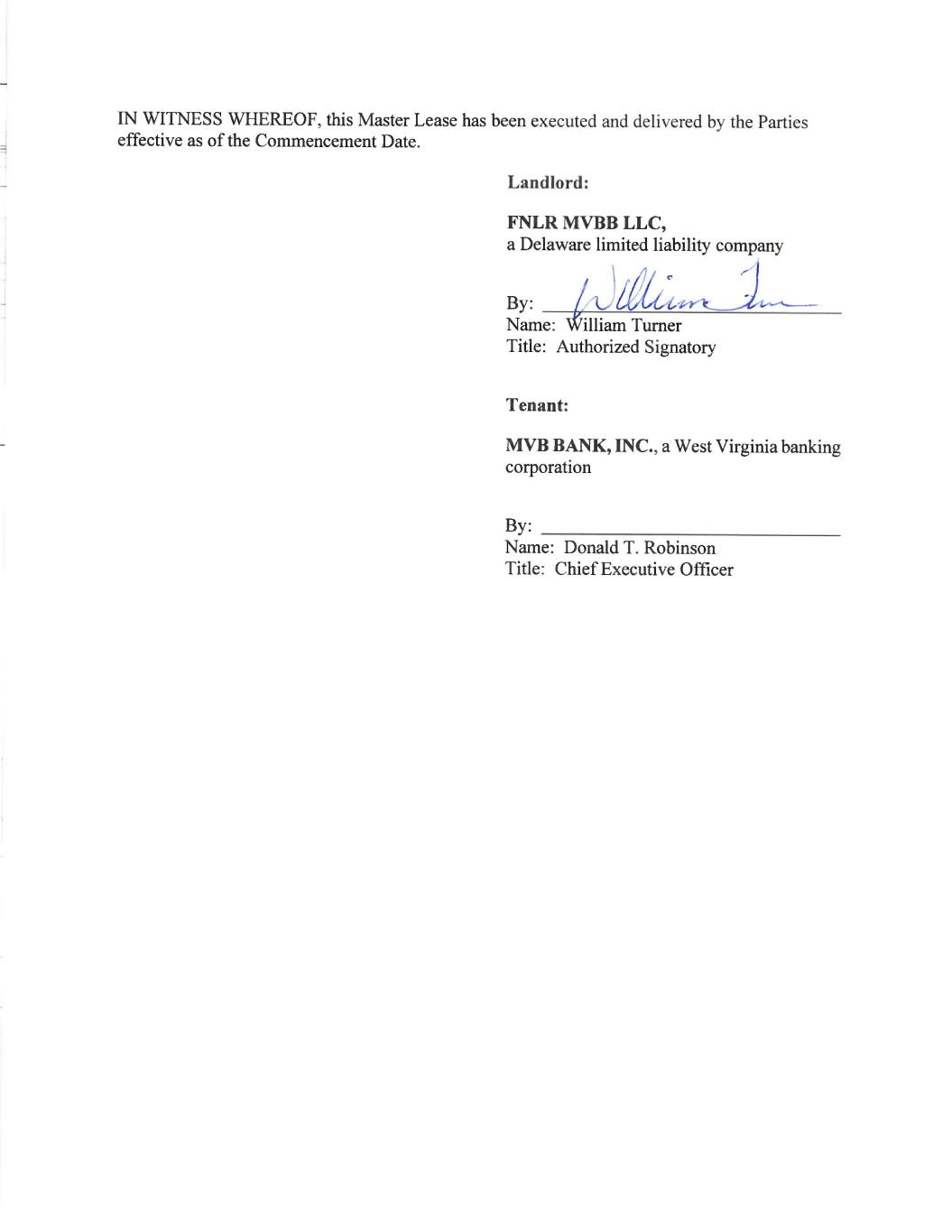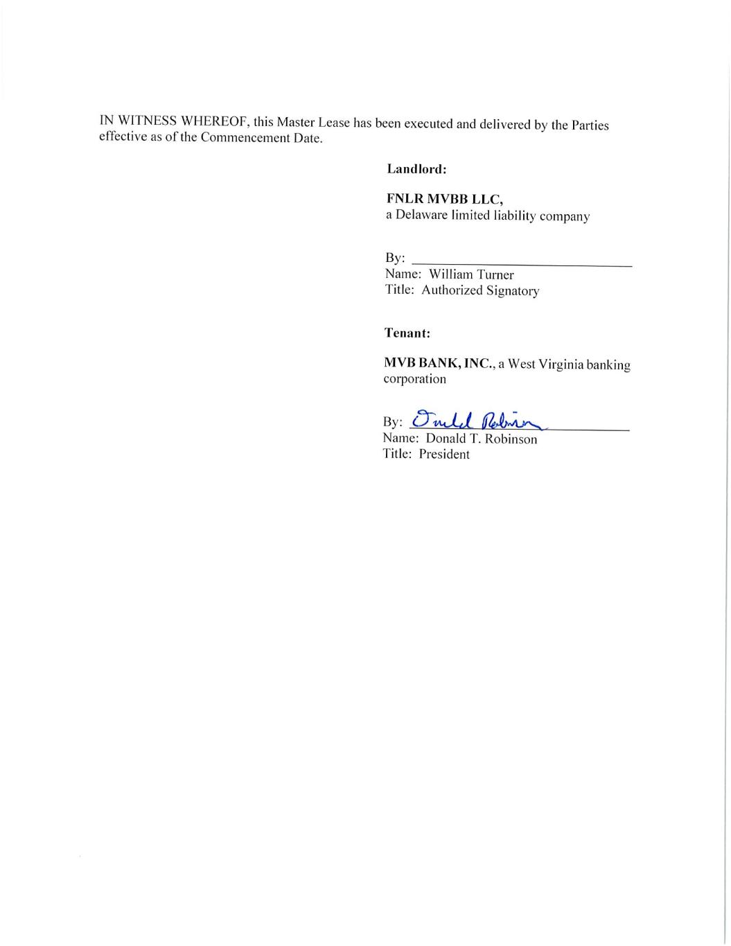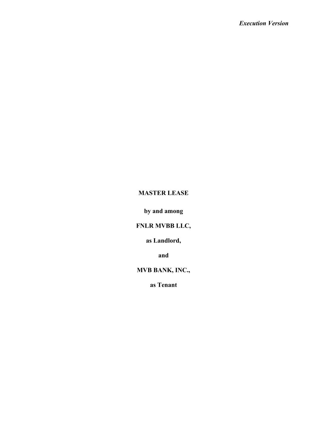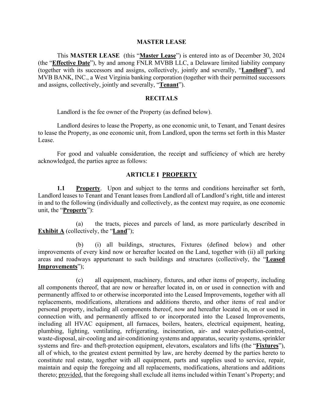 MASTER LEASE This MASTER LEASE (this “Master Lease”) is entered into as of December 30, 2024 (the “Effective Date”), by and among FNLR MVBB LLC, a Delaware limited liability company (together with its successors and assigns, collectively, jointly and severally, “Landlord”), and MVB BANK, INC., a West Virginia banking corporation (together with their permitted successors and assigns, collectively, jointly and severally, “Tenant”). RECITALS Landlord is the fee owner of the Property (as defined below). Landlord desires to lease the Property, as one economic unit, to Tenant, and Tenant desires to lease the Property, as one economic unit, from Landlord, upon the terms set forth in this Master Lease. For good and valuable consideration, the receipt and sufficiency of which are hereby acknowledged, the parties agree as follows: ARTICLE I PROPERTY 1.1 Property. Upon and subject to the terms and conditions hereinafter set forth, Landlord leases to Tenant and Tenant leases from Landlord all of Landlord’s right, title and interest in and to the following (individually and collectively, as the context may require, as one economic unit, the “Property”): (a) the tracts, pieces and parcels of land, as more particularly described in Exhibit A (collectively, the “Land”); (b) (i) all buildings, structures, Fixtures (defined below) and other improvements of every kind now or hereafter located on the Land, together with (ii) all parking areas and roadways appurtenant to such buildings and structures (collectively, the “Leased Improvements”); (c) all equipment, machinery, fixtures, and other items of property, including all components thereof, that are now or hereafter located in, on or used in connection with and permanently affixed to or otherwise incorporated into the Leased Improvements, together with all replacements, modifications, alterations and additions thereto, and other items of real and/or personal property, including all components thereof, now and hereafter located in, on or used in connection with, and permanently affixed to or incorporated into the Leased Improvements, including all HVAC equipment, all furnaces, boilers, heaters, electrical equipment, heating, plumbing, lighting, ventilating, refrigerating, incineration, air- and water-pollution-control, waste-disposal, air-cooling and air-conditioning systems and apparatus, security systems, sprinkler systems and fire- and theft-protection equipment, elevators, escalators and lifts (the “Fixtures”), all of which, to the greatest extent permitted by law, are hereby deemed by the parties hereto to constitute real estate, together with all equipment, parts and supplies used to service, repair, maintain and equip the foregoing and all replacements, modifications, alterations and additions thereto; provided, that the foregoing shall exclude all items included within Tenant’s Property; and