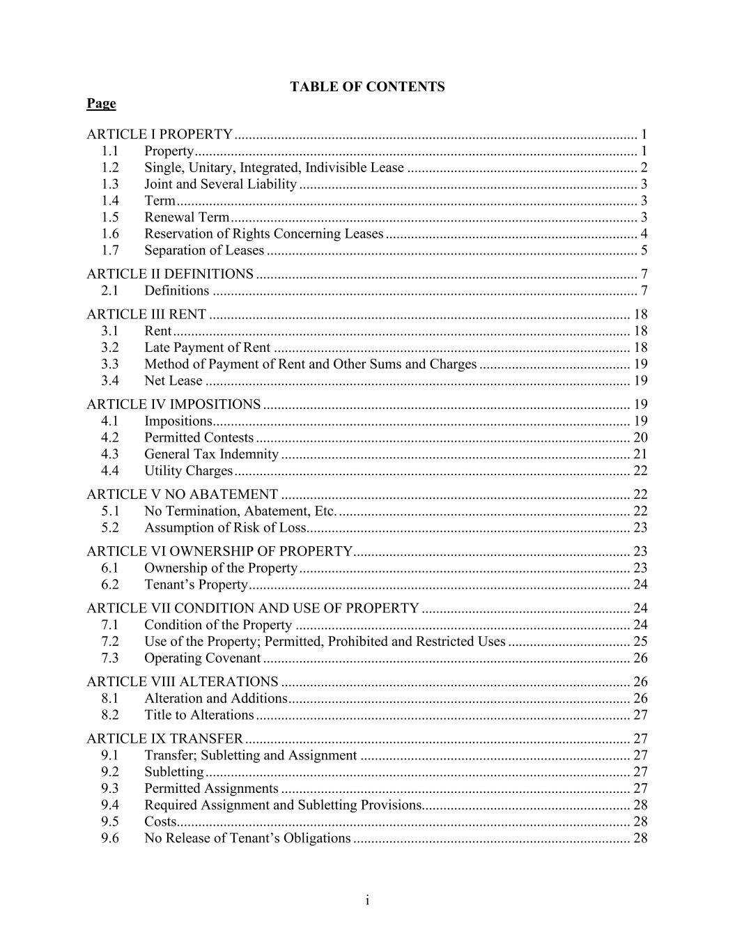 i TABLE OF CONTENTS Page ARTICLE I PROPERTY ................................................................................................................ 1 1.1 Property ........................................................................................................................... 1 1.2 Single, Unitary, Integrated, Indivisible Lease ................................................................ 2 1.3 Joint and Several Liability .............................................................................................. 3 1.4 Term ................................................................................................................................ 3 1.5 Renewal Term ................................................................................................................. 3 1.6 Reservation of Rights Concerning Leases ...................................................................... 4 1.7 Separation of Leases ....................................................................................................... 5 ARTICLE II DEFINITIONS .......................................................................................................... 7 2.1 Definitions ...................................................................................................................... 7 ARTICLE III RENT ..................................................................................................................... 18 3.1 Rent ............................................................................................................................... 18 3.2 Late Payment of Rent ................................................................................................... 18 3.3 Method of Payment of Rent and Other Sums and Charges .......................................... 19 3.4 Net Lease ...................................................................................................................... 19 ARTICLE IV IMPOSITIONS ...................................................................................................... 19 4.1 Impositions .................................................................................................................... 19 4.2 Permitted Contests ........................................................................................................ 20 4.3 General Tax Indemnity ................................................................................................. 21 4.4 Utility Charges .............................................................................................................. 22 ARTICLE V NO ABATEMENT ................................................................................................. 22 5.1 No Termination, Abatement, Etc. ................................................................................. 22 5.2 Assumption of Risk of Loss.......................................................................................... 23 ARTICLE VI OWNERSHIP OF PROPERTY............................................................................. 23 6.1 Ownership of the Property ............................................................................................ 23 6.2 Tenant’s Property .......................................................................................................... 24 ARTICLE VII CONDITION AND USE OF PROPERTY .......................................................... 24 7.1 Condition of the Property ............................................................................................. 24 7.2 Use of the Property; Permitted, Prohibited and Restricted Uses .................................. 25 7.3 Operating Covenant ...................................................................................................... 26 ARTICLE VIII ALTERATIONS ................................................................................................. 26 8.1 Alteration and Additions ............................................................................................... 26 8.2 Title to Alterations ........................................................................................................ 27 ARTICLE IX TRANSFER ........................................................................................................... 27 9.1 Transfer; Subletting and Assignment ........................................................................... 27 9.2 Subletting ...................................................................................................................... 27 9.3 Permitted Assignments ................................................................................................. 27 9.4 Required Assignment and Subletting Provisions.......................................................... 28 9.5 Costs .............................................................................................................................. 28 9.6 No Release of Tenant’s Obligations ............................................................................. 28