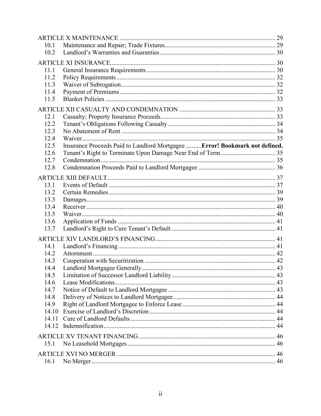 ii ARTICLE X MAINTENANCE ................................................................................................... 29 10.1 Maintenance and Repair; Trade Fixtures ...................................................................... 29 10.2 Landlord’s Warranties and Guaranties ......................................................................... 30 ARTICLE XI INSURANCE......................................................................................................... 30 11.1 General Insurance Requirements .................................................................................. 30 11.2 Policy Requirements ..................................................................................................... 32 11.3 Waiver of Subrogation .................................................................................................. 32 11.4 Payment of Premiums ................................................................................................... 32 11.5 Blanket Policies ............................................................................................................ 33 ARTICLE XII CASUALTY AND CONDEMNATION ............................................................. 33 12.1 Casualty; Property Insurance Proceeds ......................................................................... 33 12.2 Tenant’s Obligations Following Casualty .................................................................... 34 12.3 No Abatement of Rent .................................................................................................. 34 12.4 Waiver ........................................................................................................................... 35 12.5 Insurance Proceeds Paid to Landlord Mortgagee .......... Error! Bookmark not defined. 12.6 Tenant’s Right to Terminate Upon Damage Near End of Term ................................... 35 12.7 Condemnation ............................................................................................................... 35 12.8 Condemnation Proceeds Paid to Landlord Mortgagee ................................................. 36 ARTICLE XIII DEFAULT........................................................................................................... 37 13.1 Events of Default .......................................................................................................... 37 13.2 Certain Remedies .......................................................................................................... 39 13.3 Damages ........................................................................................................................ 39 13.4 Receiver ........................................................................................................................ 40 13.5 Waiver ........................................................................................................................... 40 13.6 Application of Funds .................................................................................................... 41 13.7 Landlord’s Right to Cure Tenant’s Default .................................................................. 41 ARTICLE XIV LANDLORD’S FINANCING ............................................................................ 41 14.1 Landlord’s Financing .................................................................................................... 41 14.2 Attornment .................................................................................................................... 42 14.3 Cooperation with Securitization ................................................................................... 42 14.4 Landlord Mortgagee Generally ..................................................................................... 43 14.5 Limitation of Successor Landlord Liability .................................................................. 43 14.6 Lease Modifications ...................................................................................................... 43 14.7 Notice of Default to Landlord Mortgagee .................................................................... 43 14.8 Delivery of Notices to Landlord Mortgagee ................................................................. 44 14.9 Right of Landlord Mortgagee to Enforce Lease ........................................................... 44 14.10 Exercise of Landlord’s Discretion ................................................................................ 44 14.11 Cure of Landlord Defaults ............................................................................................ 44 14.12 Indemnification ............................................................................................................. 44 ARTICLE XV TENANT FINANCING ....................................................................................... 46 15.1 No Leasehold Mortgages .............................................................................................. 46 ARTICLE XVI NO MERGER ..................................................................................................... 46 16.1 No Merger ..................................................................................................................... 46