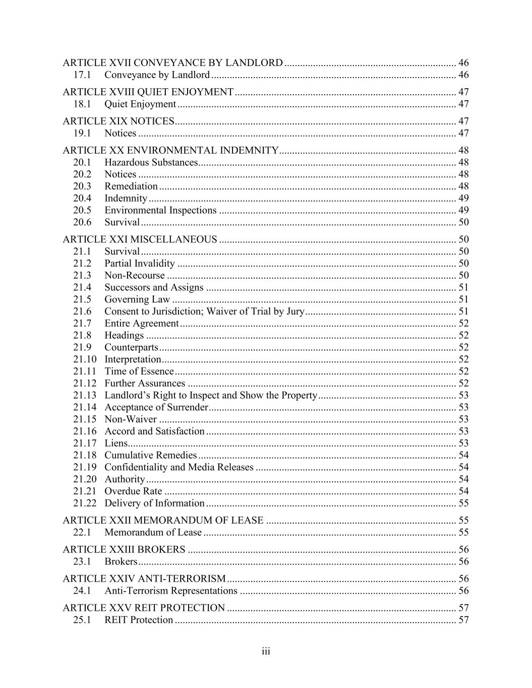 iii ARTICLE XVII CONVEYANCE BY LANDLORD .................................................................. 46 17.1 Conveyance by Landlord .............................................................................................. 46 ARTICLE XVIII QUIET ENJOYMENT ..................................................................................... 47 18.1 Quiet Enjoyment ........................................................................................................... 47 ARTICLE XIX NOTICES ............................................................................................................ 47 19.1 Notices .......................................................................................................................... 47 ARTICLE XX ENVIRONMENTAL INDEMNITY .................................................................... 48 20.1 Hazardous Substances ................................................................................................... 48 20.2 Notices .......................................................................................................................... 48 20.3 Remediation .................................................................................................................. 48 20.4 Indemnity ...................................................................................................................... 49 20.5 Environmental Inspections ........................................................................................... 49 20.6 Survival ......................................................................................................................... 50 ARTICLE XXI MISCELLANEOUS ........................................................................................... 50 21.1 Survival ......................................................................................................................... 50 21.2 Partial Invalidity ........................................................................................................... 50 21.3 Non-Recourse ............................................................................................................... 50 21.4 Successors and Assigns ................................................................................................ 51 21.5 Governing Law ............................................................................................................. 51 21.6 Consent to Jurisdiction; Waiver of Trial by Jury .......................................................... 51 21.7 Entire Agreement .......................................................................................................... 52 21.8 Headings ....................................................................................................................... 52 21.9 Counterparts .................................................................................................................. 52 21.10 Interpretation ................................................................................................................. 52 21.11 Time of Essence ............................................................................................................ 52 21.12 Further Assurances ....................................................................................................... 52 21.13 Landlord’s Right to Inspect and Show the Property ..................................................... 53 21.14 Acceptance of Surrender ............................................................................................... 53 21.15 Non-Waiver .................................................................................................................. 53 21.16 Accord and Satisfaction ................................................................................................ 53 21.17 Liens .............................................................................................................................. 53 21.18 Cumulative Remedies ................................................................................................... 54 21.19 Confidentiality and Media Releases ............................................................................. 54 21.20 Authority ....................................................................................................................... 54 21.21 Overdue Rate ................................................................................................................ 54 21.22 Delivery of Information ................................................................................................ 55 ARTICLE XXII MEMORANDUM OF LEASE ......................................................................... 55 22.1 Memorandum of Lease ................................................................................................. 55 ARTICLE XXIII BROKERS ....................................................................................................... 56 23.1 Brokers .......................................................................................................................... 56 ARTICLE XXIV ANTI-TERRORISM ........................................................................................ 56 24.1 Anti-Terrorism Representations ................................................................................... 56 ARTICLE XXV REIT PROTECTION ........................................................................................ 57 25.1 REIT Protection ............................................................................................................ 57
