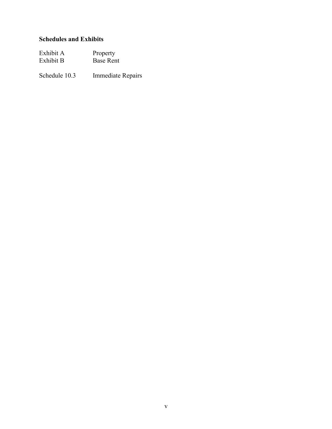 v Schedules and Exhibits Exhibit A Property Exhibit B Base Rent Schedule 10.3 Immediate Repairs