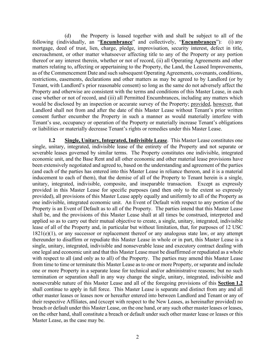 2 (d) the Property is leased together with and shall be subject to all of the following (individually, an “Encumbrance” and collectively, “Encumbrances”): (i) any mortgage, deed of trust, lien, charge, pledge, improvisation, security interest, defect in title, encroachment, or other matter whatsoever affecting title to any of the Property or any portion thereof or any interest therein, whether or not of record, (ii) all Operating Agreements and other matters relating to, affecting or appertaining to the Property, the Land, the Leased Improvements, as of the Commencement Date and such subsequent Operating Agreements, covenants, conditions, restrictions, easements, declarations and other matters as may be agreed to by Landlord (or by Tenant, with Landlord’s prior reasonable consent) so long as the same do not adversely affect the Property and otherwise are consistent with the terms and conditions of this Master Lease, in each case whether or not of record, and (iii) all Permitted Encumbrances, including any matters which would be disclosed by an inspection or accurate survey of the Property; provided, however, that Landlord shall not from and after the date of this Master Lease without Tenant’s prior written consent further encumber the Property in such a manner as would materially interfere with Tenant’s use, occupancy or operation of the Property or materially increase Tenant’s obligations or liabilities or materially decrease Tenant’s rights or remedies under this Master Lease. 1.2 Single, Unitary, Integrated, Indivisible Lease. This Master Lease constitutes one single, unitary, integrated, indivisible lease of the entirety of the Property and not separate or severable leases governed by similar terms. The Property constitutes one indivisible, integrated economic unit, and the Base Rent and all other economic and other material lease provisions have been extensively negotiated and agreed to, based on the understanding and agreement of the parties (and each of the parties has entered into this Master Lease in reliance thereon, and it is a material inducement to each of them), that the demise of all of the Property to Tenant herein is a single, unitary, integrated, indivisible, composite, and inseparable transaction. Except as expressly provided in this Master Lease for specific purposes (and then only to the extent so expressly provided), all provisions of this Master Lease apply equally and uniformly to all of the Property as one indivisible, integrated economic unit. An Event of Default with respect to any portion of the Property is an Event of Default as to all of the Property. The parties intend that this Master Lease shall be, and the provisions of this Master Lease shall at all times be construed, interpreted and applied so as to carry out their mutual objective to create, a single, unitary, integrated, indivisible lease of all of the Property and, in particular but without limitation, that, for purposes of 12 USC 1821(e)(1), or any successor or replacement thereof or any analogous state law, or any attempt thereunder to disaffirm or repudiate this Master Lease in whole or in part, this Master Lease is a single, unitary, integrated, indivisible and nonseverable lease and executory contract dealing with one legal and economic unit and that this Master Lease must be disaffirmed or repudiated as a whole with respect to all (and only as to all) of the Property. The parties may amend this Master Lease from time to time or terminate this Master Lease as to one or more Property, or separate and include one or more Property in a separate lease for technical and/or administrative reasons; but no such termination or separation shall in any way change the single, unitary, integrated, indivisible and nonseverable nature of this Master Lease and all of the foregoing provisions of this Section 1.2 shall continue to apply in full force. This Master Lease is separate and distinct from any and all other master leases or leases now or hereafter entered into between Landlord and Tenant or any of their respective Affiliates, and (except with respect to the New Leases, as hereinafter provided) no breach or default under this Master Lease, on the one hand, or any such other master leases or leases, on the other hand, shall constitute a breach or default under such other master lease or leases or this Master Lease, as the case may be.