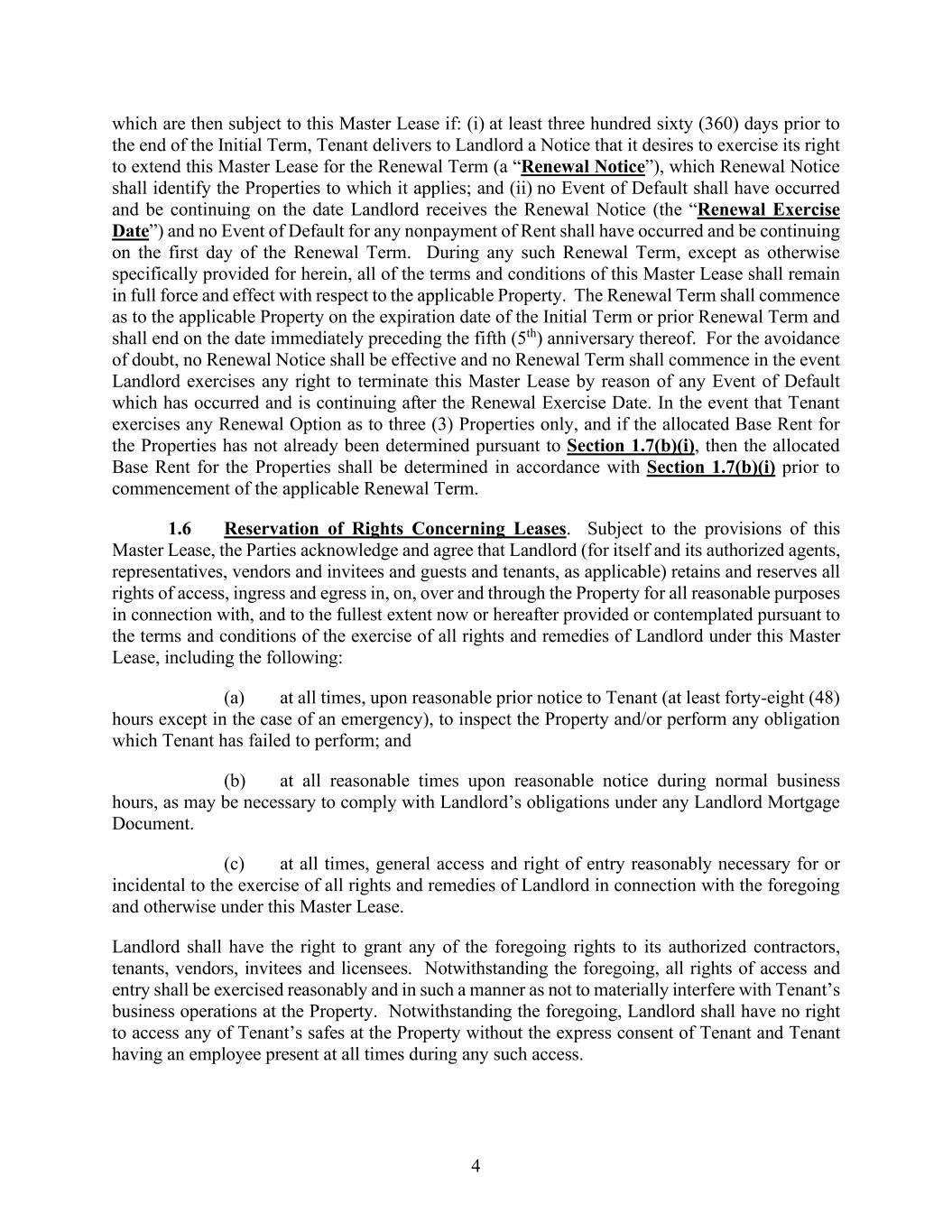4 which are then subject to this Master Lease if: (i) at least three hundred sixty (360) days prior to the end of the Initial Term, Tenant delivers to Landlord a Notice that it desires to exercise its right to extend this Master Lease for the Renewal Term (a “Renewal Notice”), which Renewal Notice shall identify the Properties to which it applies; and (ii) no Event of Default shall have occurred and be continuing on the date Landlord receives the Renewal Notice (the “Renewal Exercise Date”) and no Event of Default for any nonpayment of Rent shall have occurred and be continuing on the first day of the Renewal Term. During any such Renewal Term, except as otherwise specifically provided for herein, all of the terms and conditions of this Master Lease shall remain in full force and effect with respect to the applicable Property. The Renewal Term shall commence as to the applicable Property on the expiration date of the Initial Term or prior Renewal Term and shall end on the date immediately preceding the fifth (5th) anniversary thereof. For the avoidance of doubt, no Renewal Notice shall be effective and no Renewal Term shall commence in the event Landlord exercises any right to terminate this Master Lease by reason of any Event of Default which has occurred and is continuing after the Renewal Exercise Date. In the event that Tenant exercises any Renewal Option as to three (3) Properties only, and if the allocated Base Rent for the Properties has not already been determined pursuant to Section 1.7(b)(i), then the allocated Base Rent for the Properties shall be determined in accordance with Section 1.7(b)(i) prior to commencement of the applicable Renewal Term. 1.6 Reservation of Rights Concerning Leases. Subject to the provisions of this Master Lease, the Parties acknowledge and agree that Landlord (for itself and its authorized agents, representatives, vendors and invitees and guests and tenants, as applicable) retains and reserves all rights of access, ingress and egress in, on, over and through the Property for all reasonable purposes in connection with, and to the fullest extent now or hereafter provided or contemplated pursuant to the terms and conditions of the exercise of all rights and remedies of Landlord under this Master Lease, including the following: (a) at all times, upon reasonable prior notice to Tenant (at least forty-eight (48) hours except in the case of an emergency), to inspect the Property and/or perform any obligation which Tenant has failed to perform; and (b) at all reasonable times upon reasonable notice during normal business hours, as may be necessary to comply with Landlord’s obligations under any Landlord Mortgage Document. (c) at all times, general access and right of entry reasonably necessary for or incidental to the exercise of all rights and remedies of Landlord in connection with the foregoing and otherwise under this Master Lease. Landlord shall have the right to grant any of the foregoing rights to its authorized contractors, tenants, vendors, invitees and licensees. Notwithstanding the foregoing, all rights of access and entry shall be exercised reasonably and in such a manner as not to materially interfere with Tenant’s business operations at the Property. Notwithstanding the foregoing, Landlord shall have no right to access any of Tenant’s safes at the Property without the express consent of Tenant and Tenant having an employee present at all times during any such access.